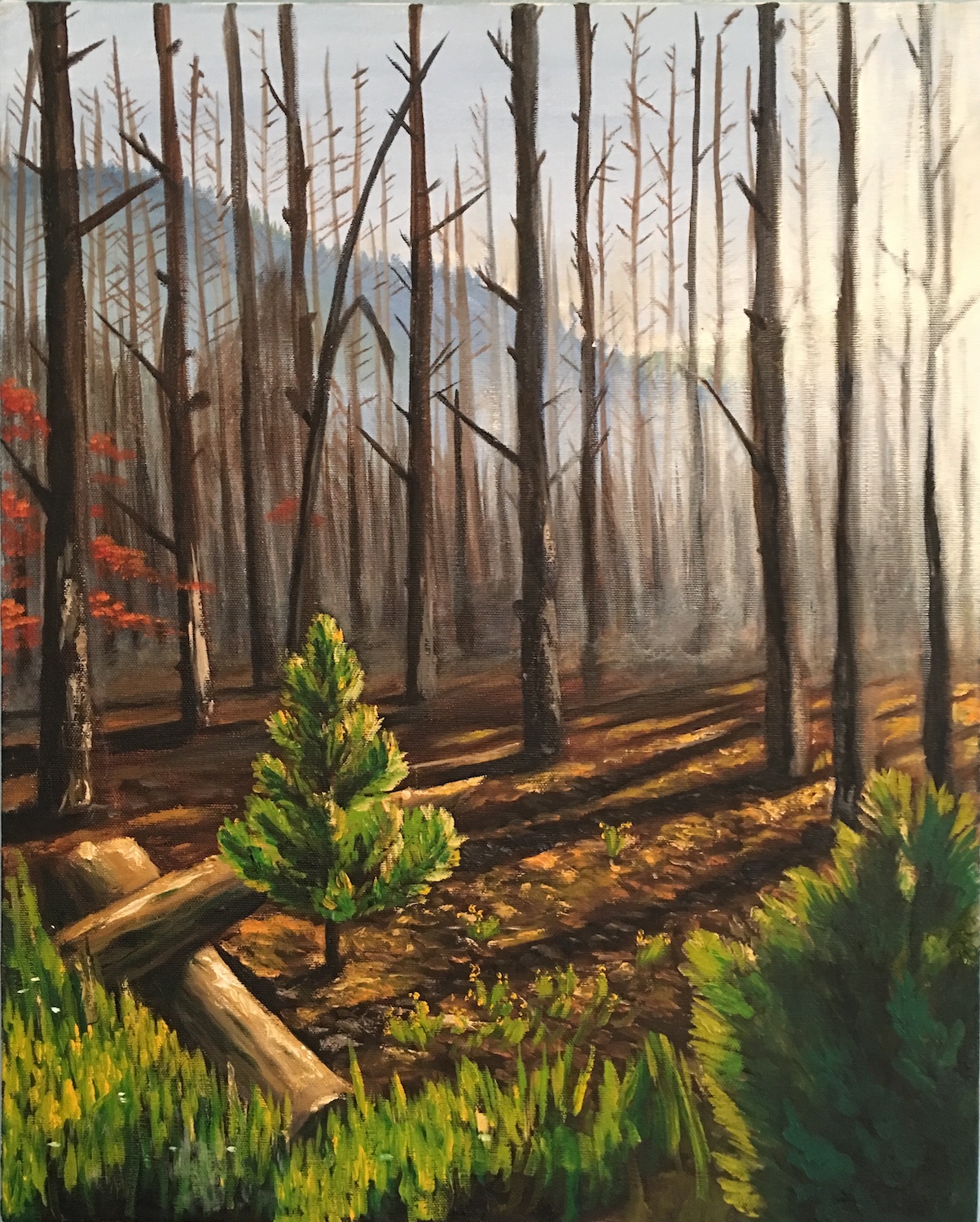 Let’s come back to the painting. While we were in Yellowstone, I learned something about forest fires. There are certain kinds of trees that need fire in order to reproduce. Their seed pods will only open under extreme heat. So, periodically, by God’s design, lightning will strike a dead tree, it will catch on fire, and a devastating fire will sweep through the forest and leave nothing but ashes in its wake. But then, in the dark soil of ruin, new life begins. A green shoot forces its way up into the sunshine and the forest is reborn.