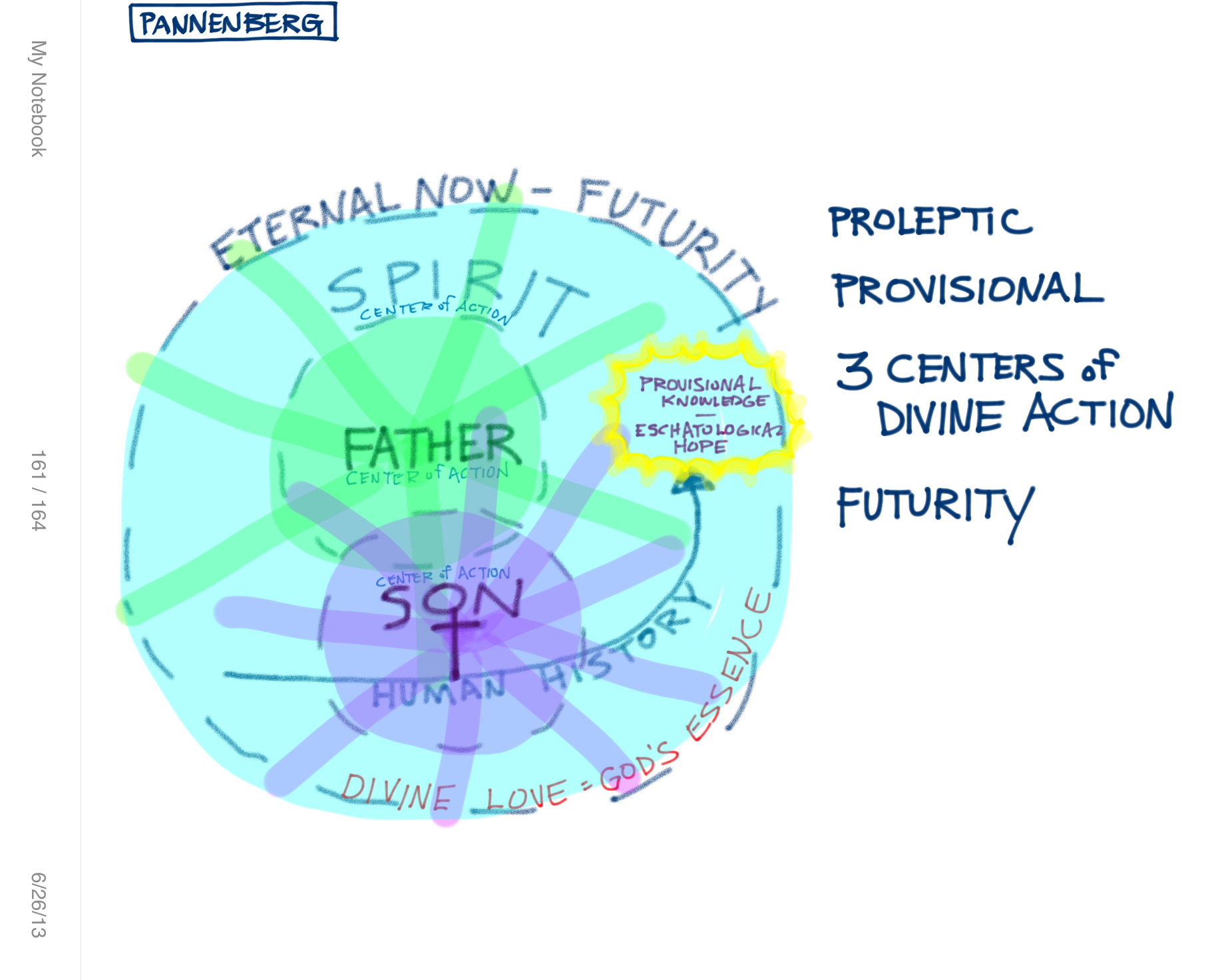 I would summarize Pannenberg’s theology in the idea that God is love. “The eternal God as the absolute future, in the fellowship of Father, Son, and Spirit, is the free origin of himself and his creatures.”[11] Some theologians have understood God’s creation and omnipotence in the terms of God’s rule. This connotes domination, but God “can be thought of only as the power of divine love and not as the assertion of a particular authority against all opposition.”[12] The theses of divine immutability as it has been developed throughout church history has led to the idea of dominance, but “if eternity and time coincide only in the eschatological consummation of history, then from the standpoint of the history of God that moves toward this consummation there is room for becoming in God himself, namely, in the relation of the immanent and the economic Trinity….The creative love of God finds fulfillment only with the faithfulness of God on the way of his historical action and with the revelation of his righteousness as the Creator of the world.”[13] This loving, faithful God is a God of patience, and “patience leaves to others space for their own existence and time for the unfolding of their own being.”[14] God is bringing God’s creation, through the patient action with us in history, into the fulfillment of God’s desire for unity in the relationality of the particularities in love with all things. This is the flavor and the ontology of Pannenberg that I have gleaned so far.