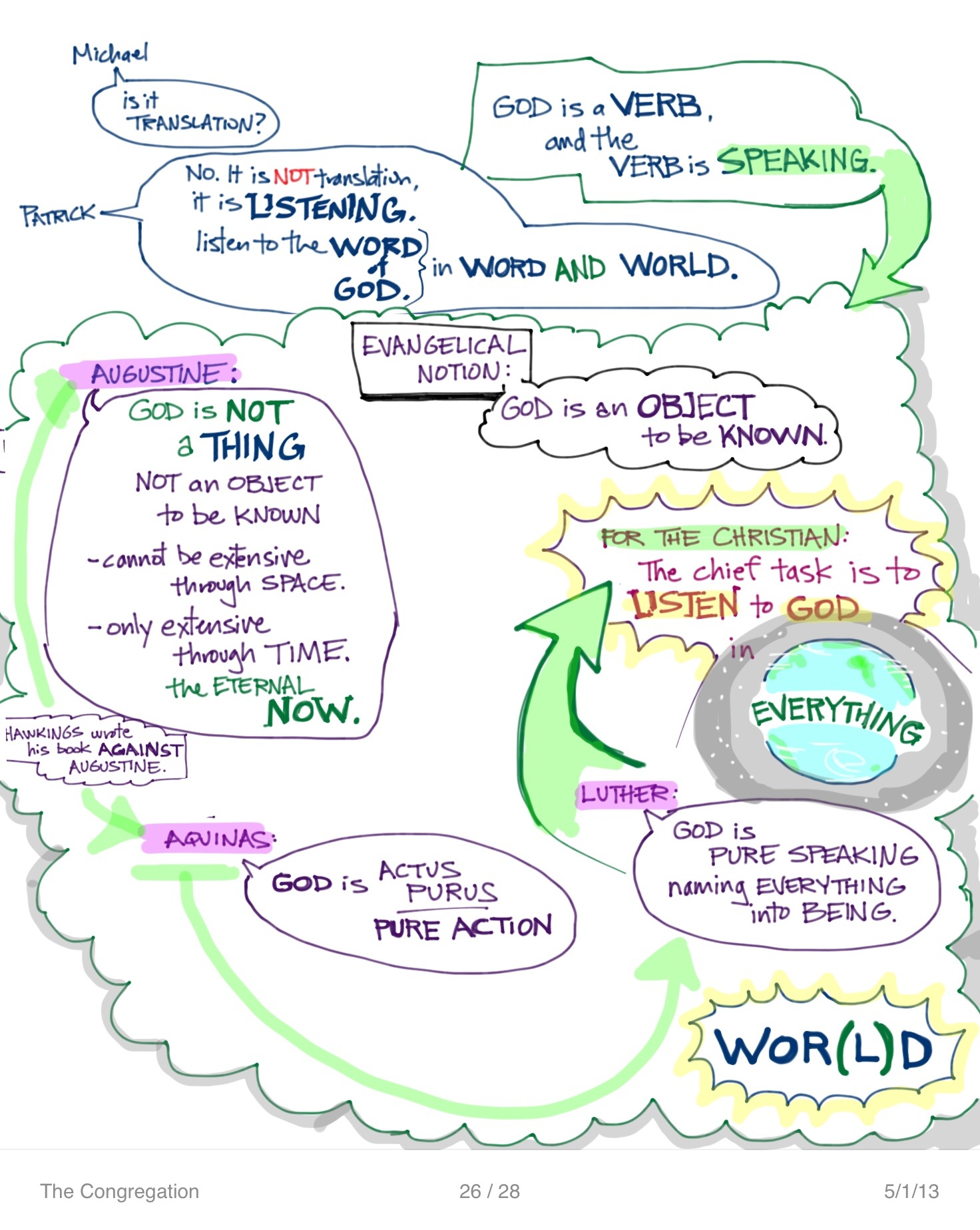 I am currently reading Translating the Message by Lamin Sanneh. His thesis is that translation is the process of entering the vernacular and allowing the Gospel to find its own voice within the host culture. It is a helpful revisioning of the standard polemic against the colonization of Christendom to the Global South. However, it reminded me of a conversation we had in my Congregation class with Dr. Keifert this Spring. The following illustration is my note page from Keifert’s response to the question, “isn’t it translation (a reference to Sanneh’s work)?” I looked at it again today and was reminded of the deep theological and ecclesial significance of listening.