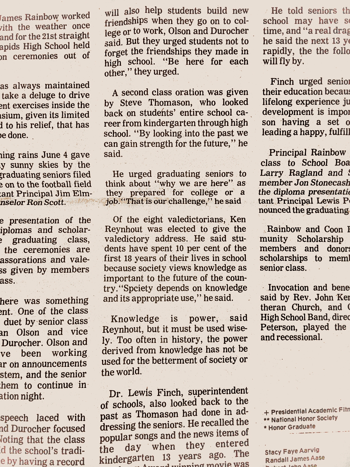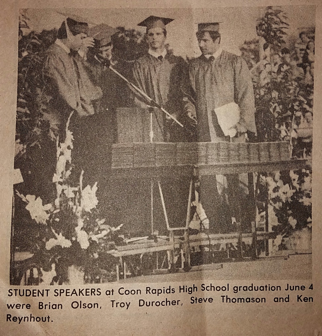 I opened it up and there it was. The ABC Newspaper from June, 1986. The photograph showed four young men standing on the platform. We were chosen, for different reasons, to deliver a speech at our high school graduation. Brian Olson and Troy Durocher were our class president and vice-president, super-strong athletes, fellow football players, best friends, smart, funny, and genuinely nice guys. Ken Reynhout was the valedictorian (there were 8) who was chosen to speak, a brilliant student, talented musician, and fellow choir and drama member. I was chosen to speak from some kind of people’s choice vote, I think.