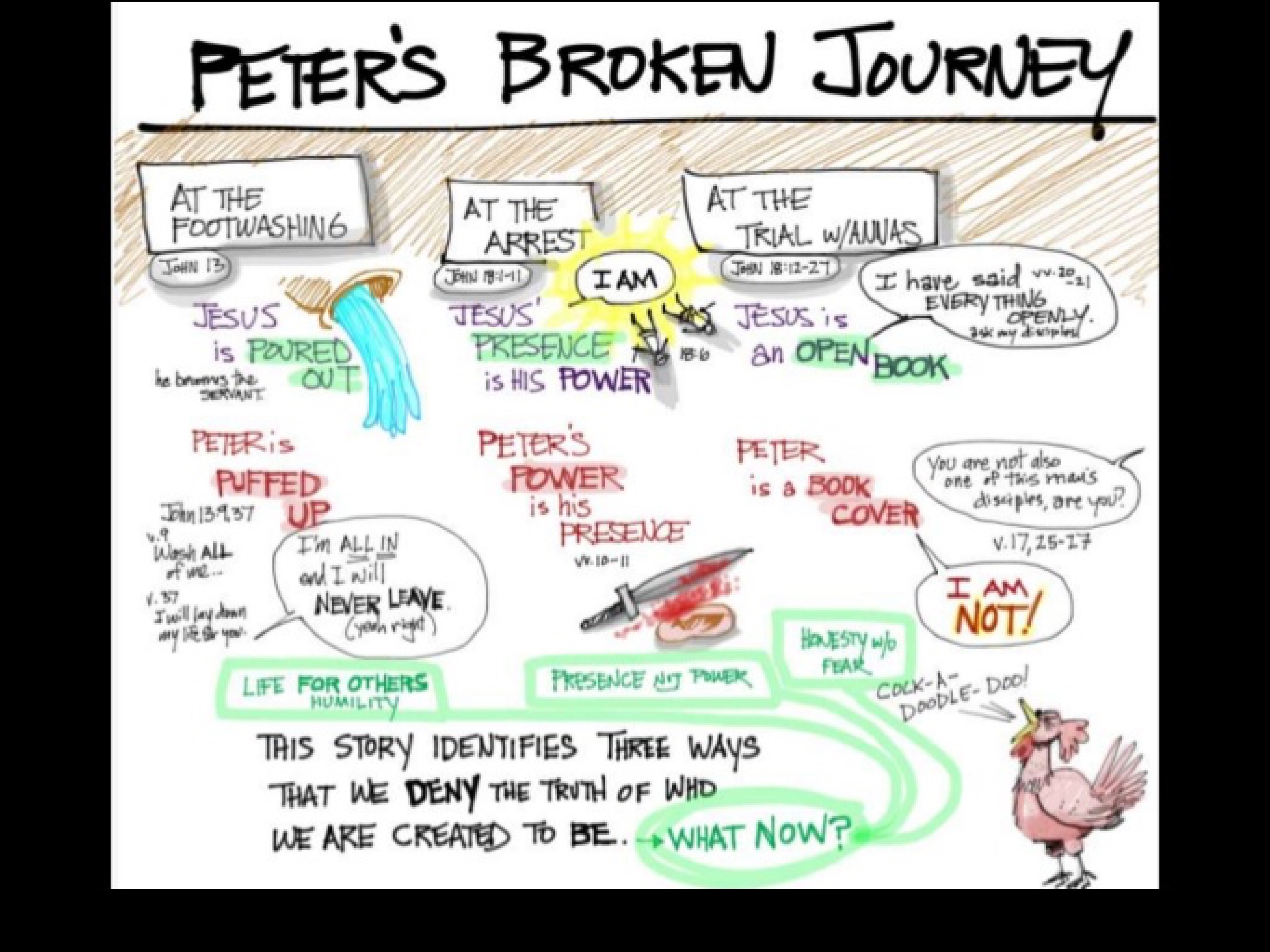 When I look at these three stories I see a contrast between Jesus and Peter. Jesus demonstrates for us the model of what we are called to be, and Peter shows us what we are usually like as we stumble and bumble our way along this Broken Journey. I call this Peter’s Broken Journey.