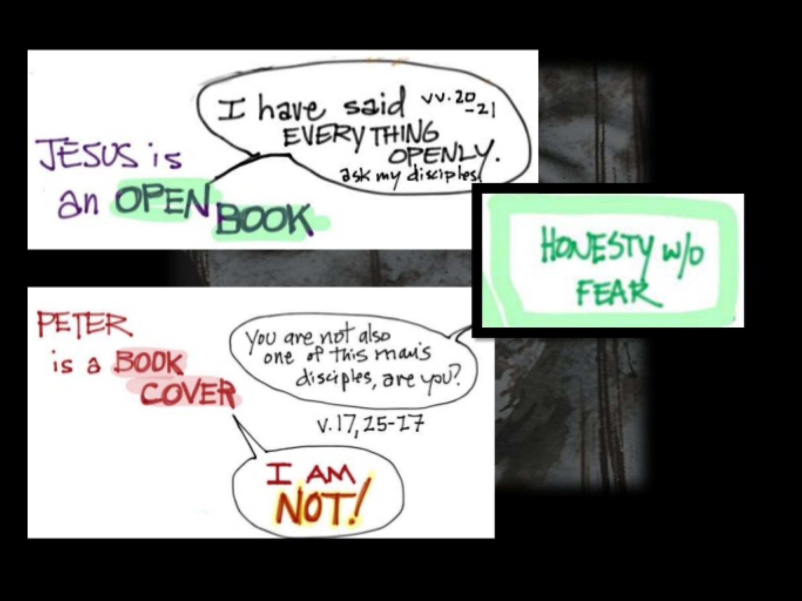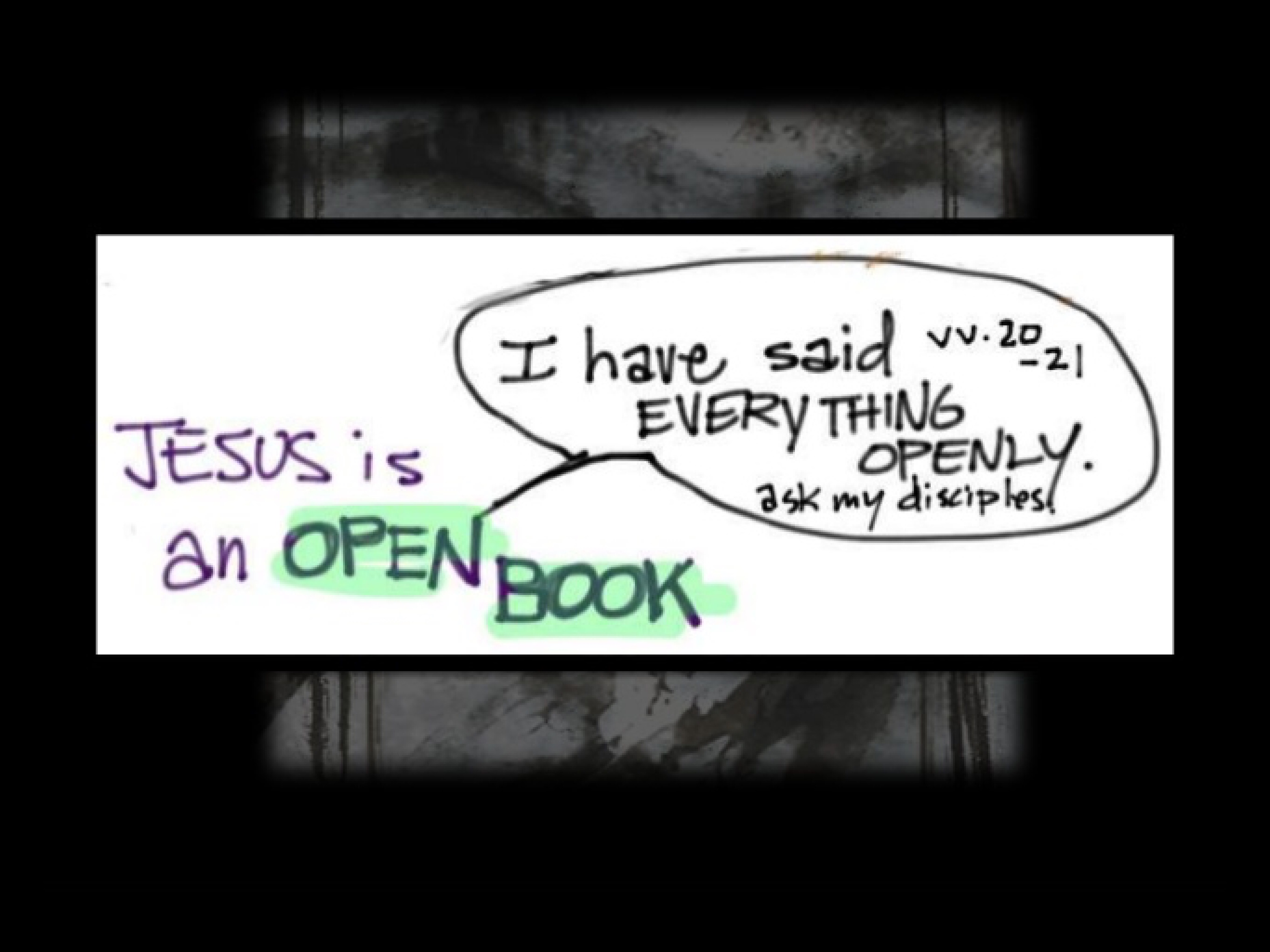 Jesus is an open book. He has nothing to hide. He has done everything in plain sight. There is no fear. The guard smacks him in the face for it, but Jesus doesn’t back down. It’s all out there. An open book.