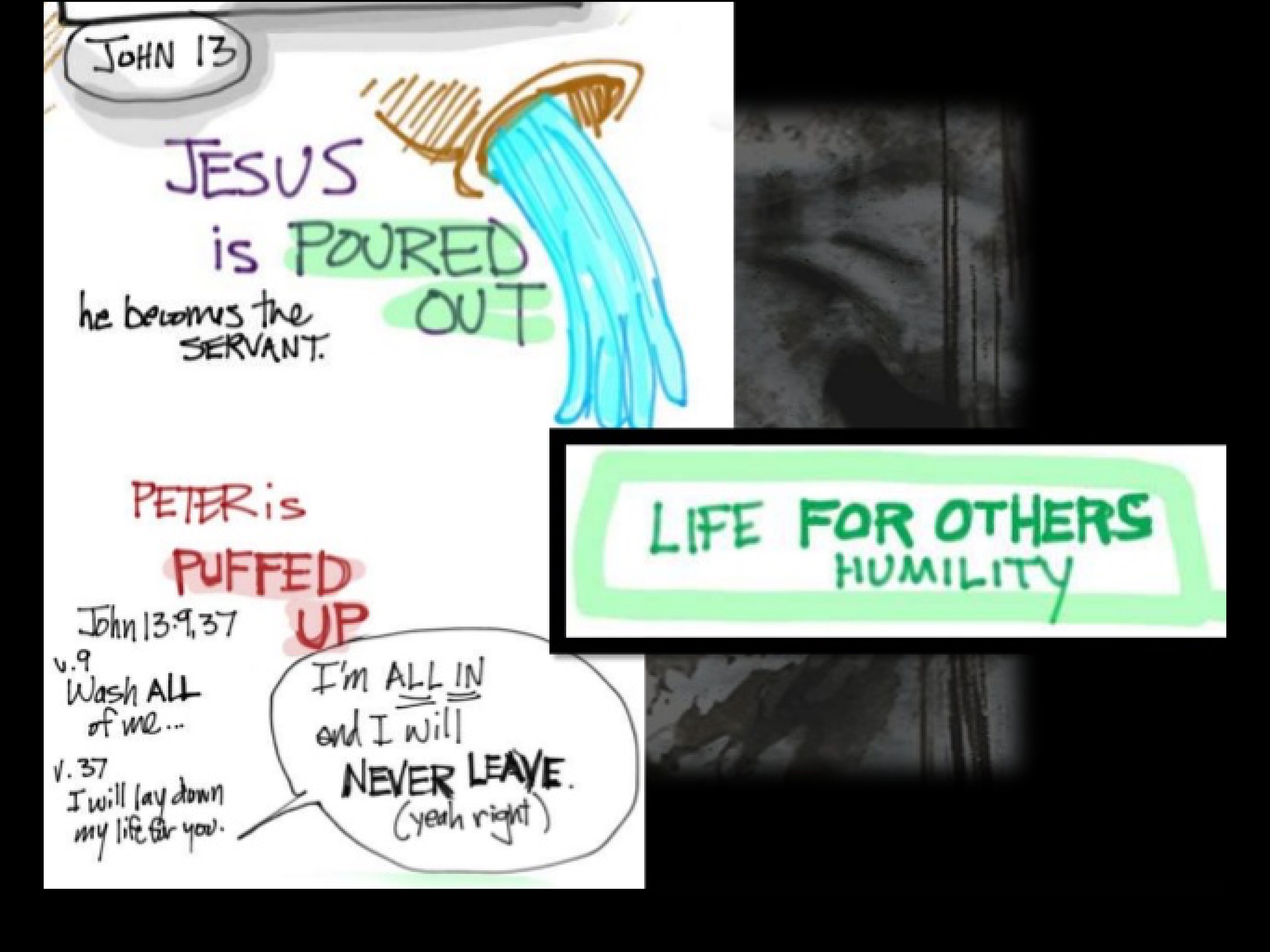 This is found in John 13. Grab your Bibles and turn there with me. This is the scene where Jesus washes the feet of his disciples. Do you remember how Pastor Mark poured the water into the basin. Here we see that Jesus became a servant and was poured out, like water, to serve his disciples.