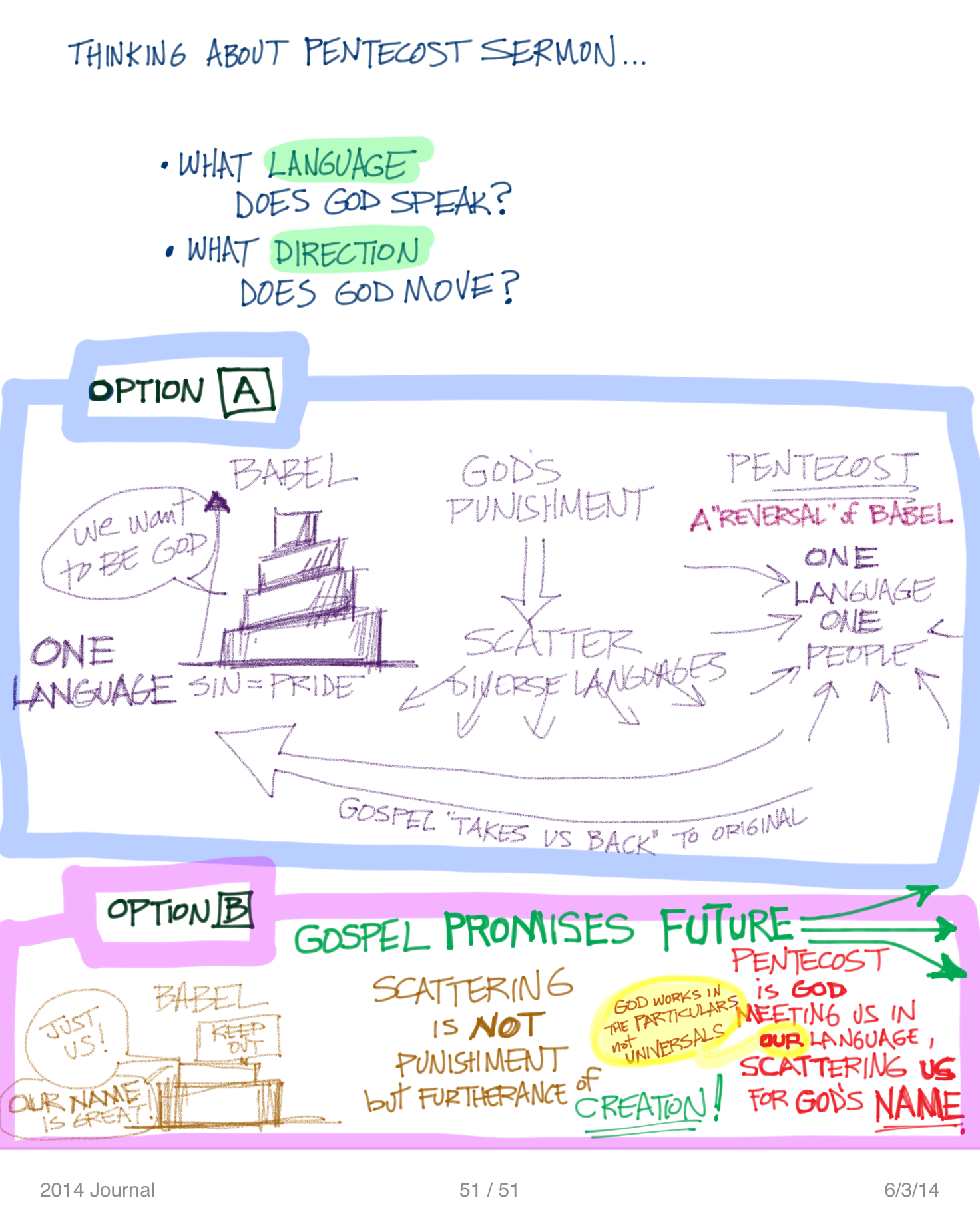 These texts also intersect with one other text. We often connect Pentecost to the Tower of Babel story in Genesis 11:1-9. The people had one language, they built a tower (or a fortified city) for themselves, and said two key things: (1) Let’s make a name for ourselves, and (2) Let’s not get scattered into the earth. God saw this and did two things: (1) God confused their language so that they spoke multiple languages and didn’t understand each other, and (2) God scattered them into the earth.