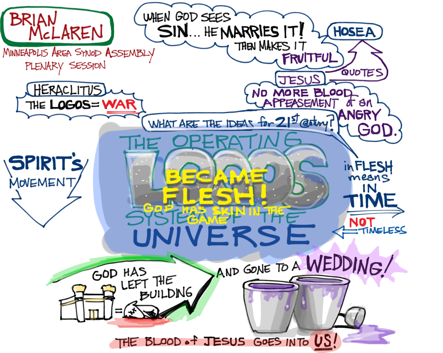 Brian McLaren gave the plenary presentation last night at the Minneapolis Area Synod Assembly. Our theme this year is from The Message version of John 1, “and God became flesh…and moved into the neighborhood.” McLaren did a nice theological reflection on the Logos. He said it is like the inner logic, or the operating system of the universe. Heraclitus, the ancient Greek philosopher said that the Logos is War and Strife. John offered an alternative Logos in which God becomes flesh and moves into the neighborhood. God now has “skin in the game” and seeks to redeem and renew all things through life-giving peace.