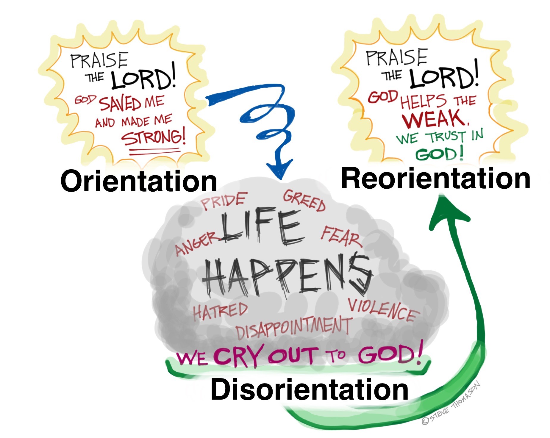 Throughout this series we have used Walter Brueggemann’s idea that the Psalms take us through a process of orientation, disorientation, reorientation. As I read Psalm 146 for today’s sermon, and saw the list of God’s actions, and the people for whom God is concerned, it sparked this doodle.