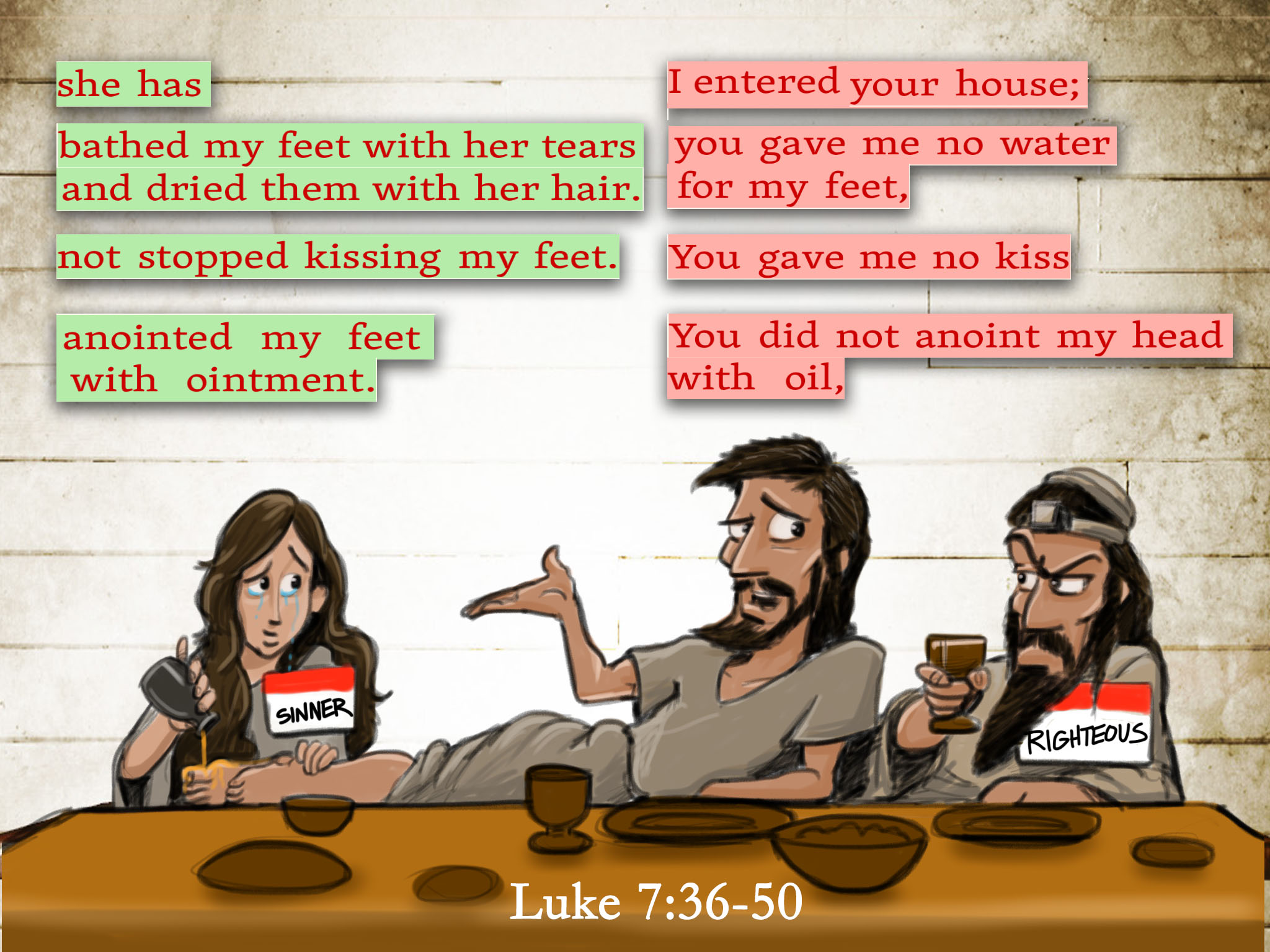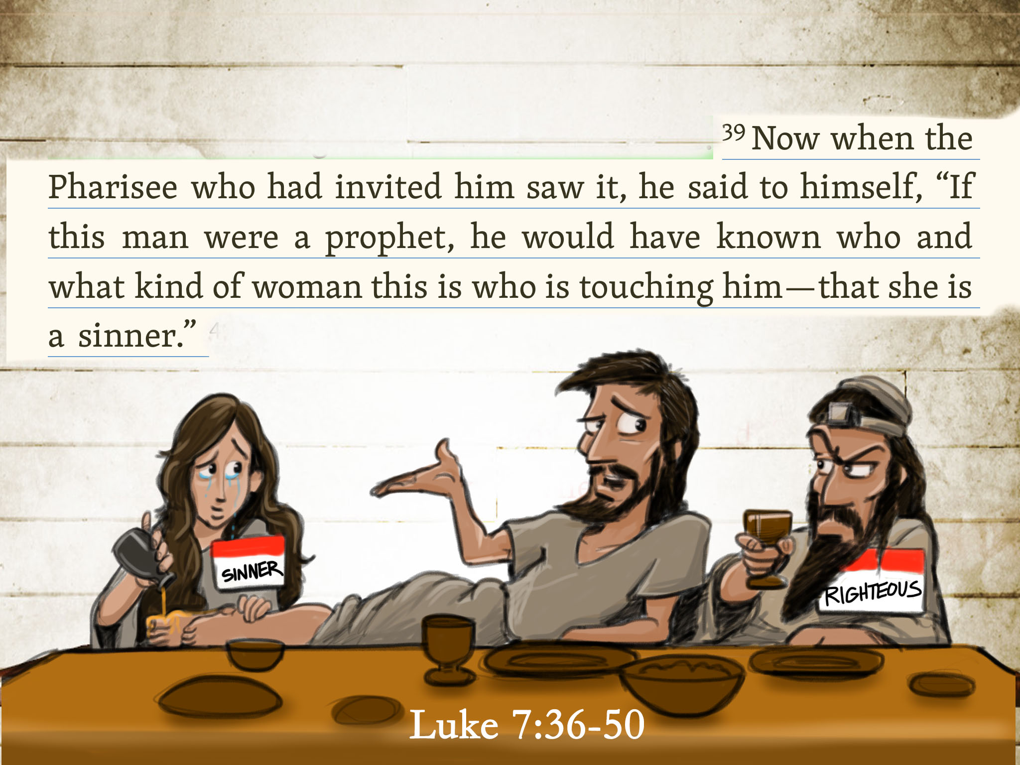 This is an awkward situation. A man who considers himself righteous because he obeys the Law of Moses invites Jesus, the alleged prophet and/or Messiah into his home, only to be invaded by a sinner. Her presence makes the whole dinner unclean.