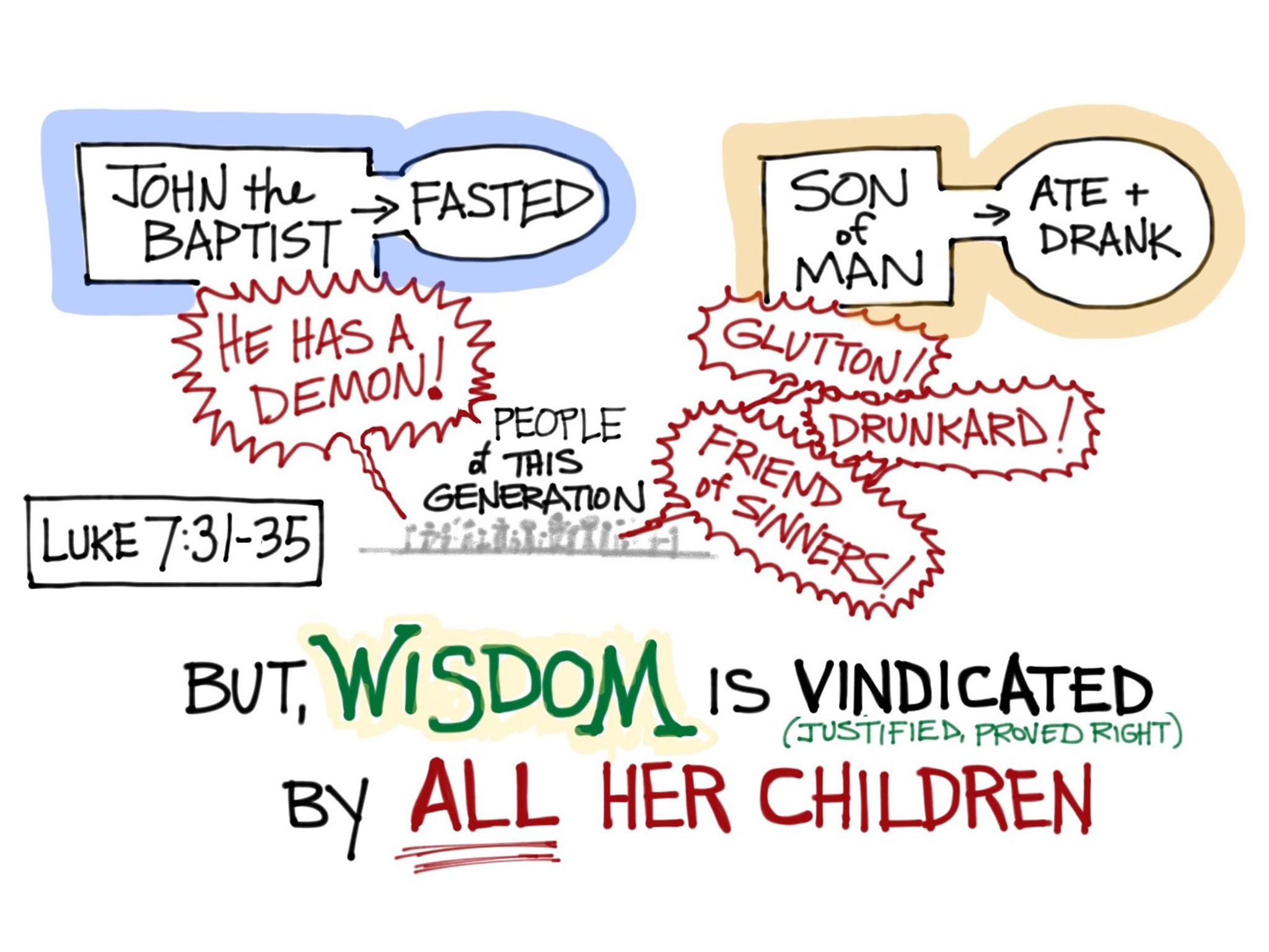 I think we need to frame this story in two ways. First, look at the verses immediately before it. the “people of this generation” includes people like Simon the Pharisee. They can’t be satisfied. They are looking for the wrong thing. But, “Wisdom–the thing they claim to be seeking–will be vindicated.”