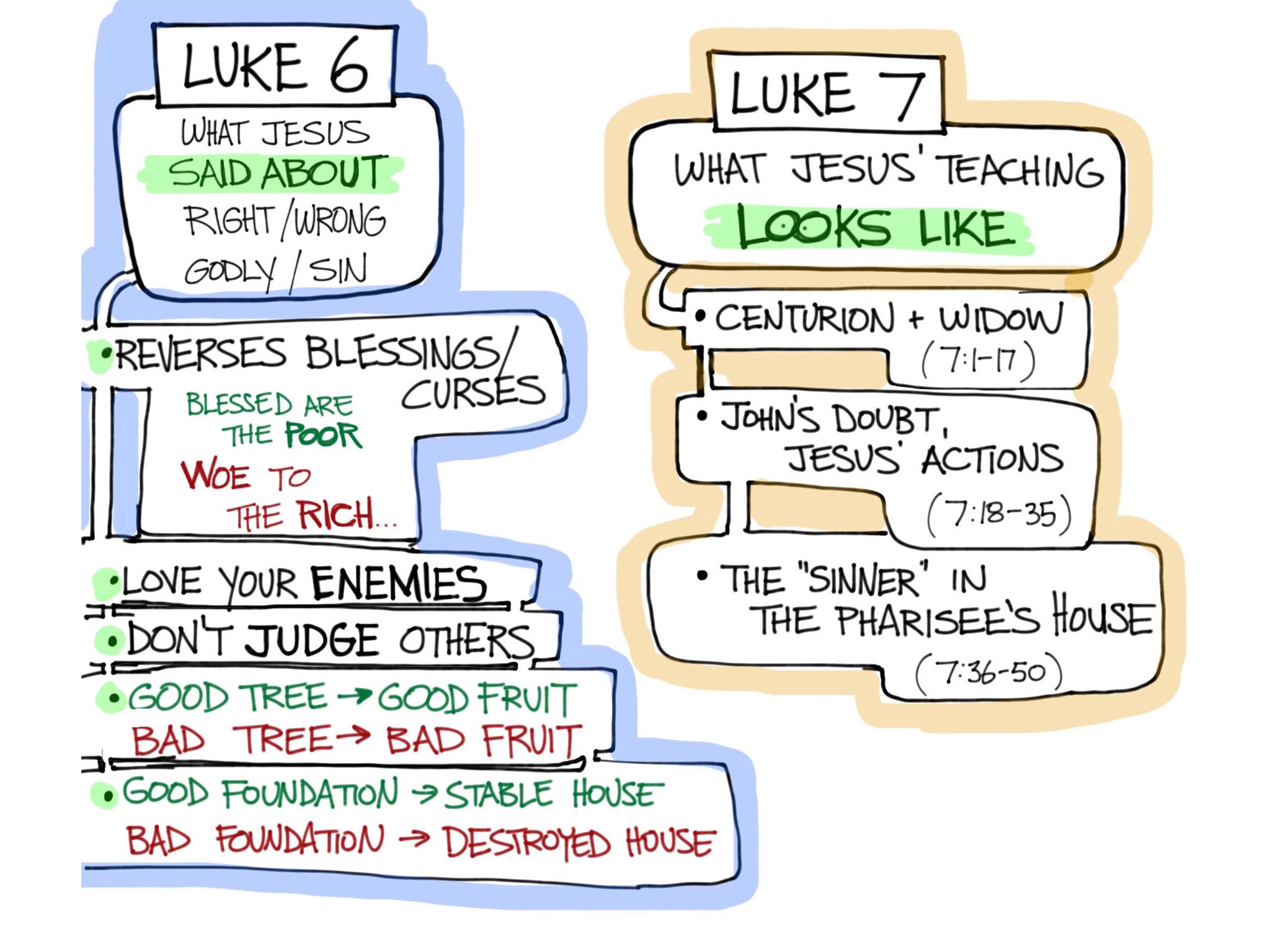 Chapter 7 demonstrates what Jesus’ teaching looks like lived out. The Centurion’s faith, Jesus’ compassion on the widow, John’s doubt in contrast to Jesus’ compassion, and, now, this story of the fruit bearing witness to the heart.
