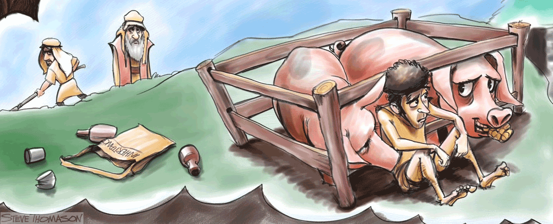 11 Then Jesus said, “There was a man who had two sons. 12 The younger of them said to his father, ‘Father, give me the share of the property that will belong to me.’ So he divided his property between them. 13 A few days later the younger son gathered all he had and traveled to a distant country, and there he squandered his property in dissolute living. 14 When he had spent everything, a severe famine took place throughout that country, and he began to be in need. 15 So he went and hired himself out to one of the citizens of that country, who sent him to his fields to feed the pigs. 16 He would gladly have filled himself with the pods that the pigs were eating; and no one gave him anything. 17 But when he came to himself he said, ‘How many of my father’s hired hands have bread enough and to spare, but here I am dying of hunger! (Luke 15:11–17. NRSV)