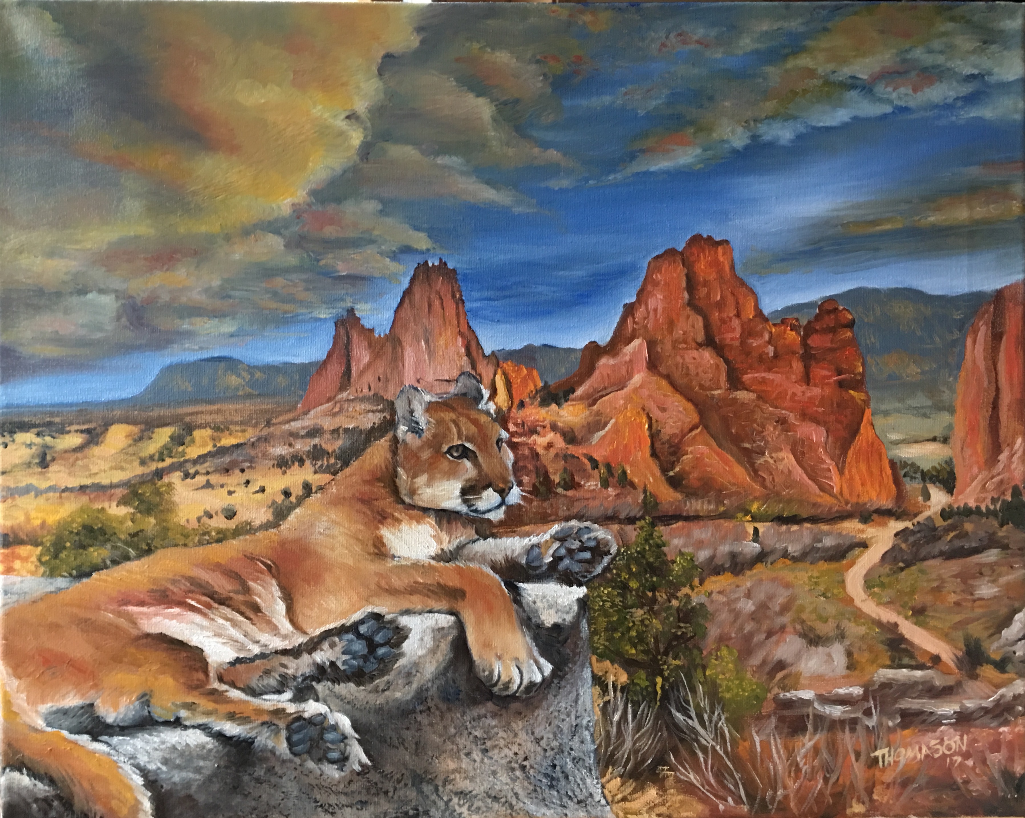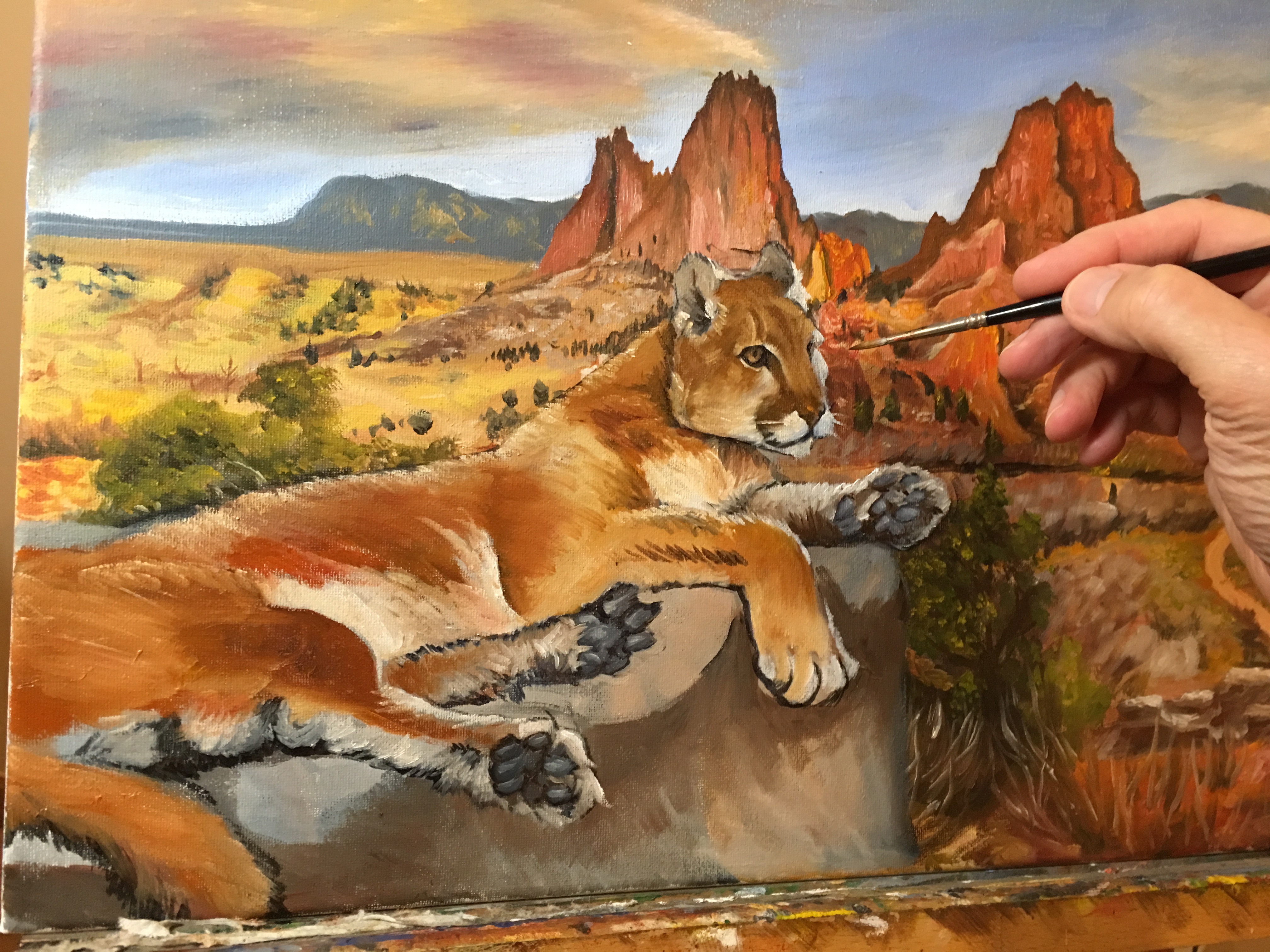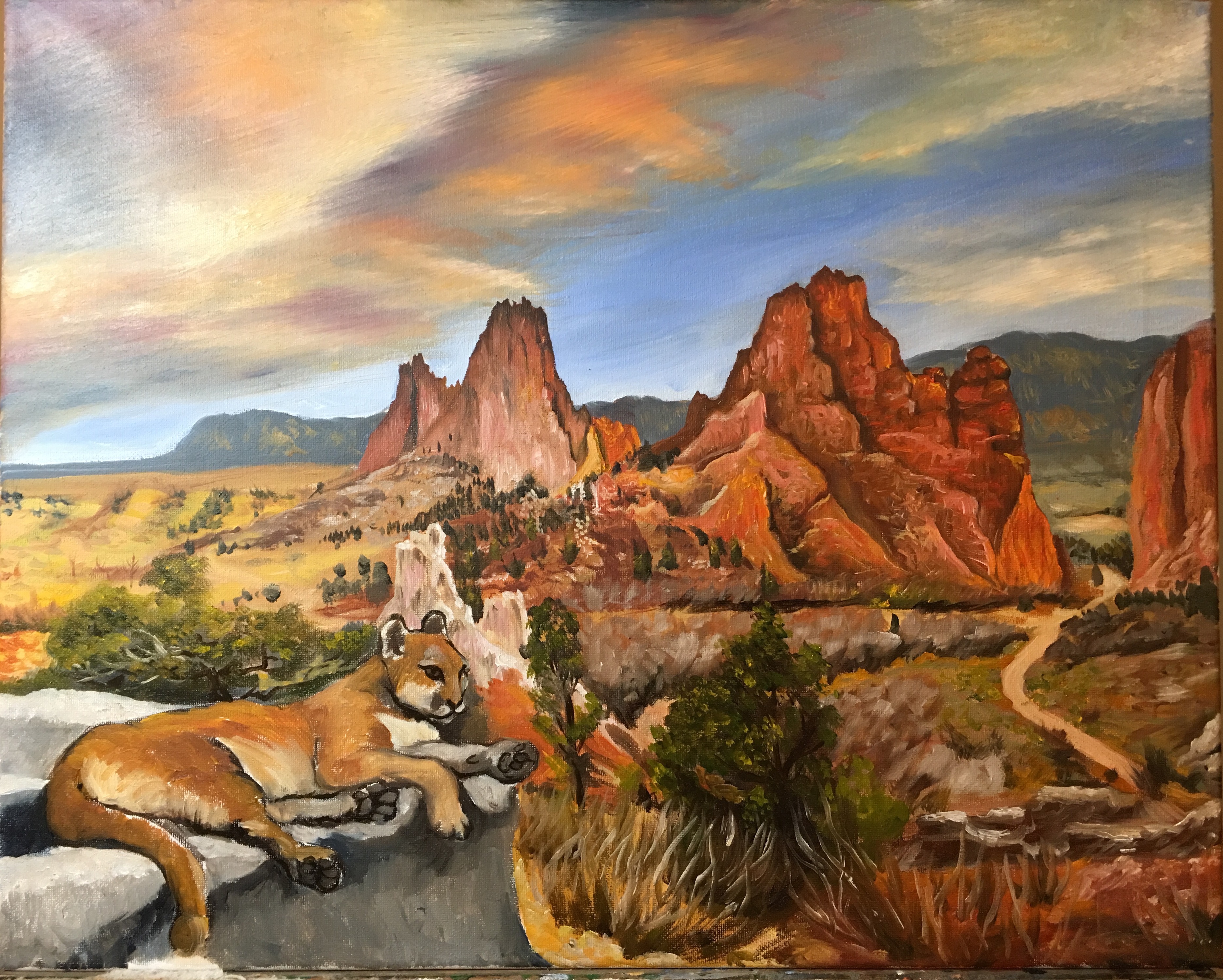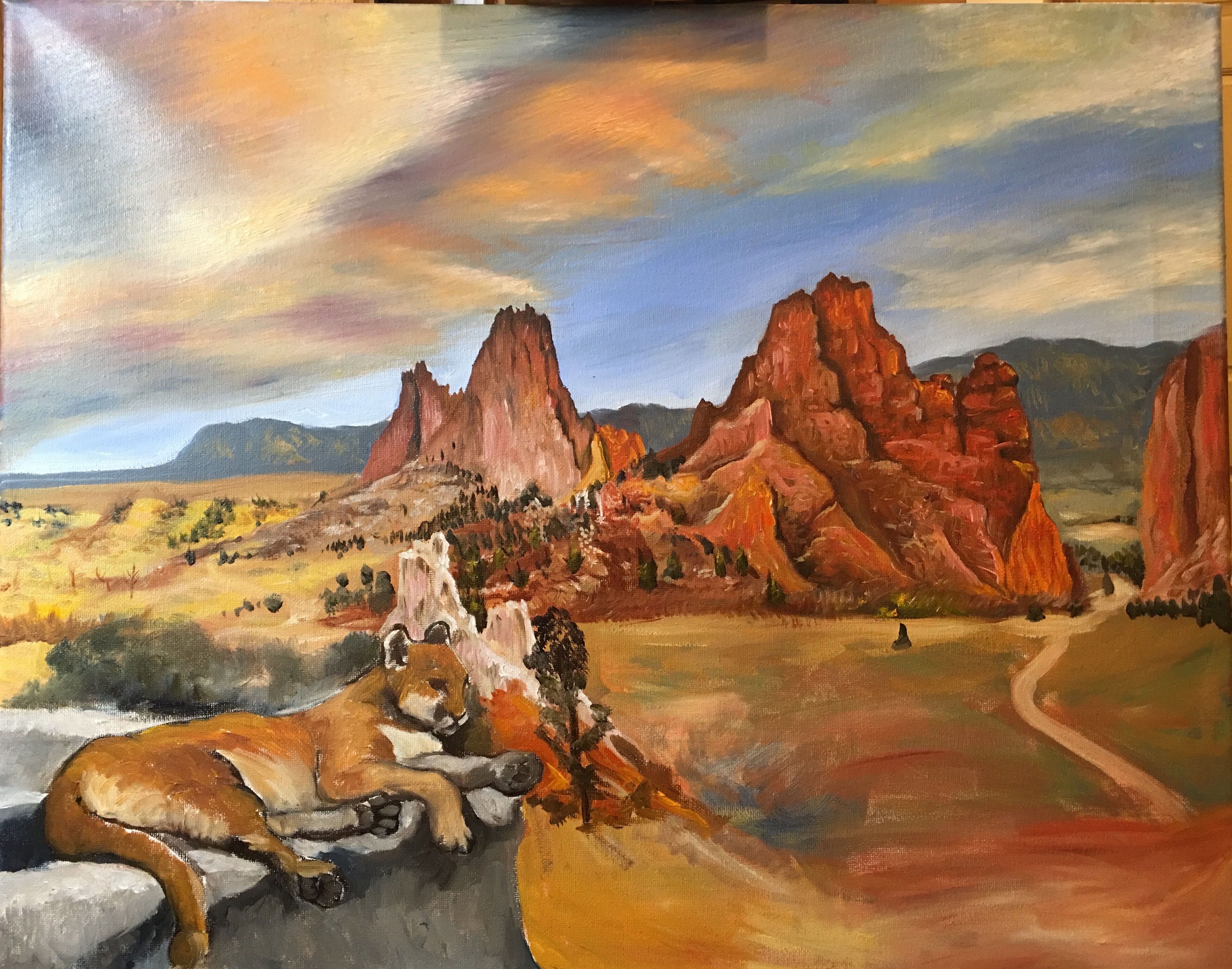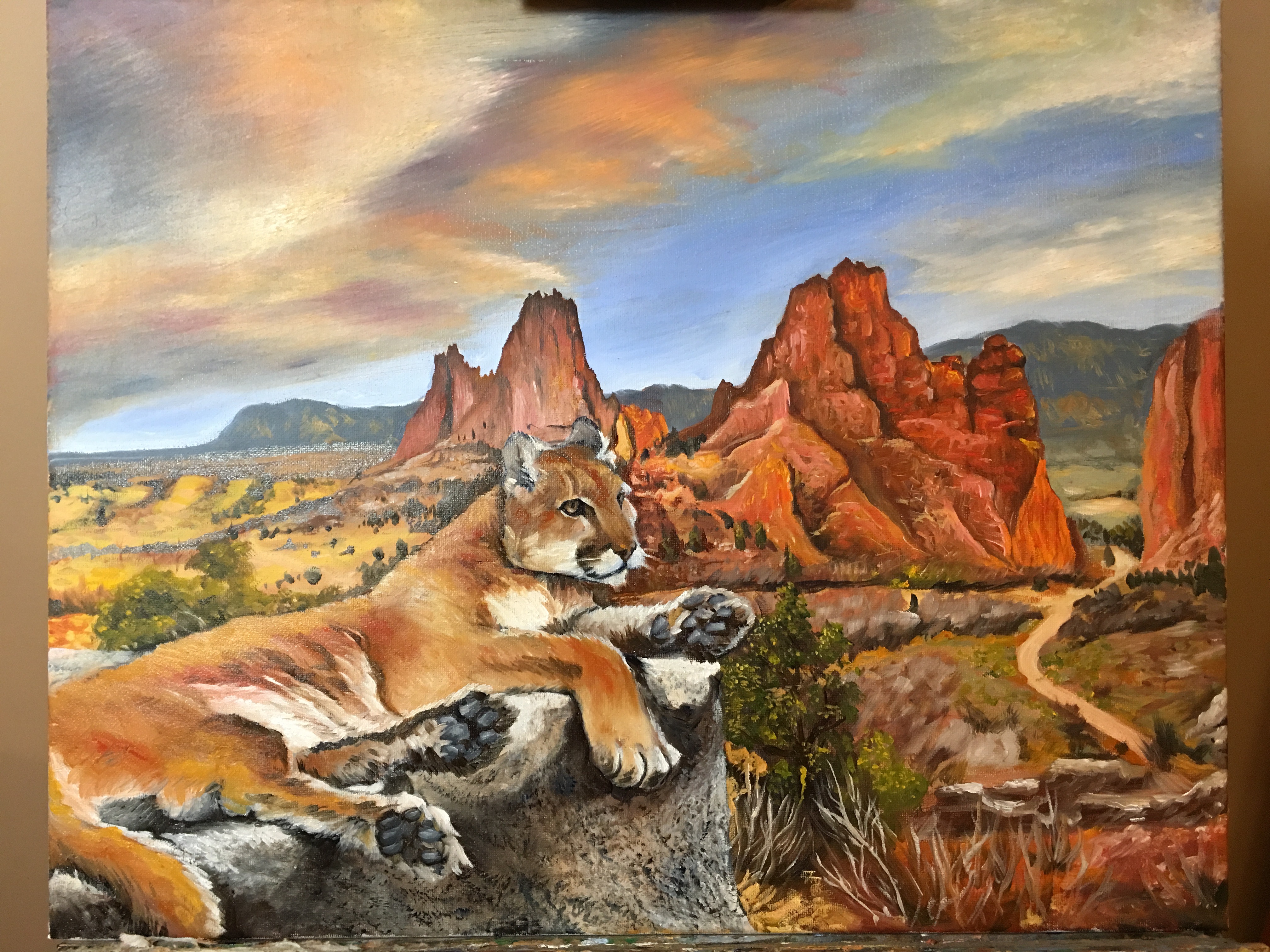 My daughter, Leah, is going to graduate from high school in a month. She asked me to paint something for her as a graduation gift. We decided it would be a mountain lion sitting in front of the Garden of the Gods park in Colorado Springs. Why? Because she is going to UCCS (University of Colorado, Colorado Springs) next fall and they are the Mountain Lions.