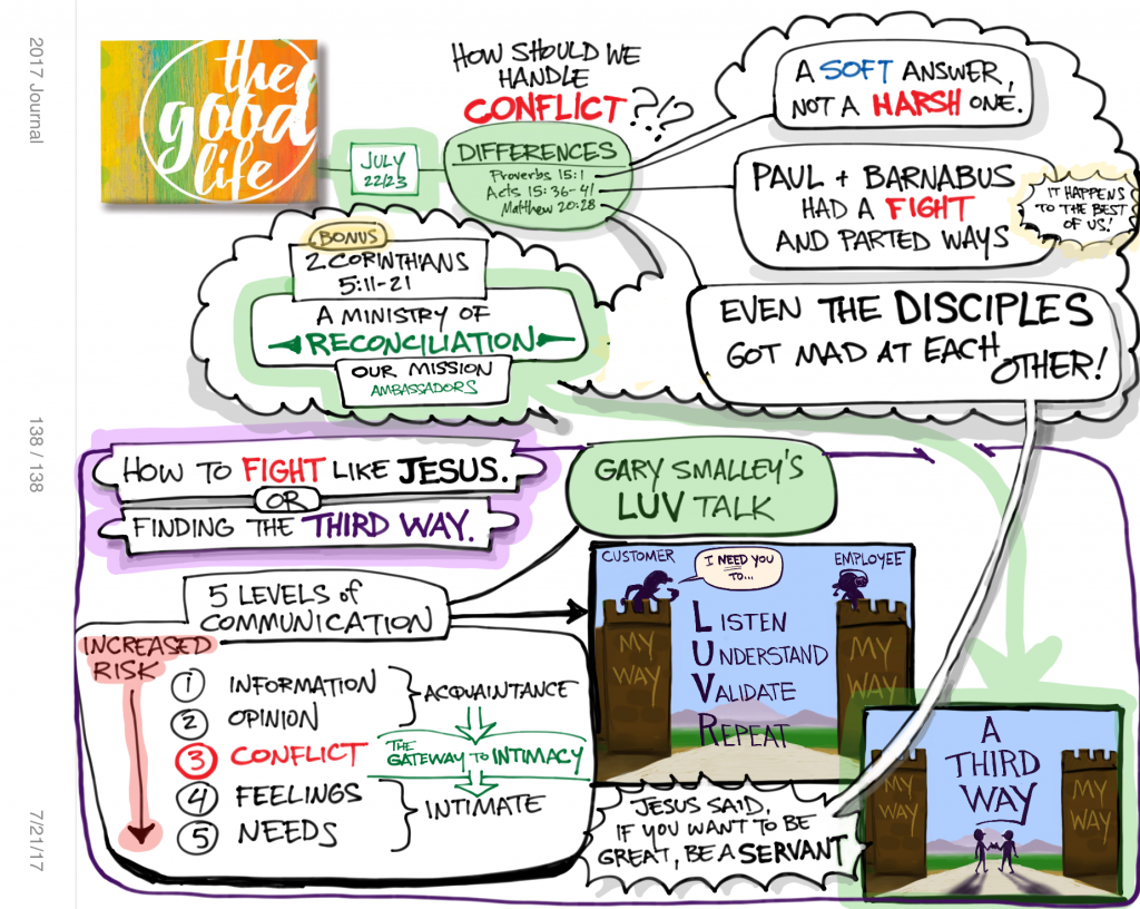This week we are talking about how to deal with Conflict. This is the mind map I sketched to think through the sermon. I will not use this actual image in the sermon, but I have illustrated Gary Smalley’s LUV Talk. I decided to get really practical and offer the congregation a tool that has helped me navigate conflict situations for many years.