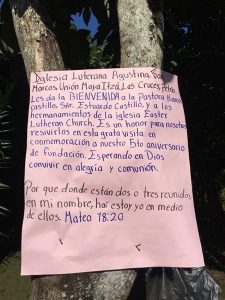 What I saw was a very simple structure made of wooden posts that held up a tin roof. The structure was encased in freshly cut, green palm branches. My interpreter wasn’t with me, so I was lost in both visual information confusion and the language barrier. Victor grabbed my arm, pulled me toward a tree, said, “Pastor Esteban,” and pointed to a hand-written sign nailed to the tree.