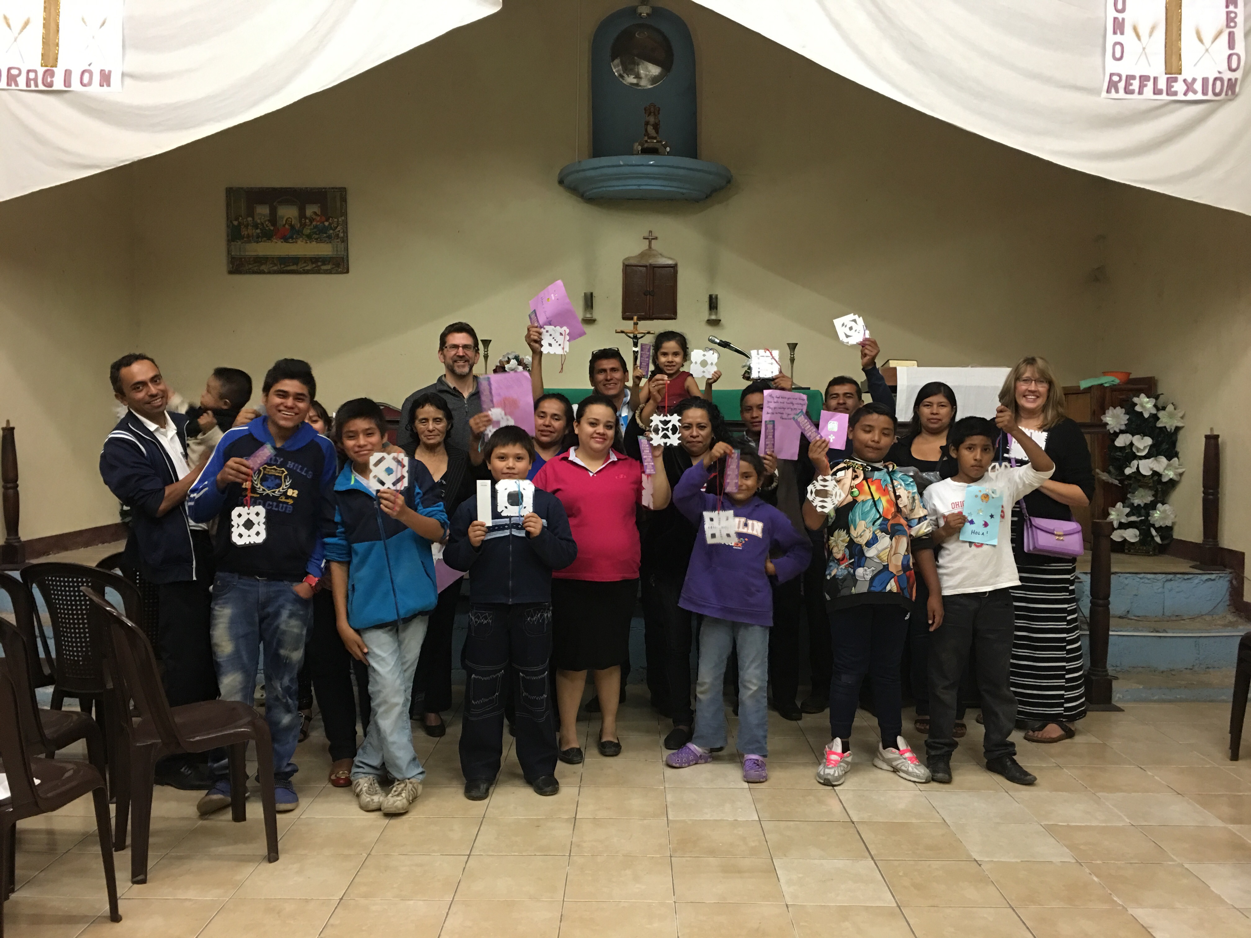 Estuardo drove Pastor Karen, Denise, and me to the Iglesia Divina Salvador del Mundo. This church was founded 30 years ago when a group of people from the country migrated to the city because of the war. They occupied an empty ravine and build a neighborhood. ILAG connected with them many years ago and has built a strong partnership. The neighborhood is a winding maze of narrow streets, tin houses, and struggles with poverty, gangs, drugs, and violence.
