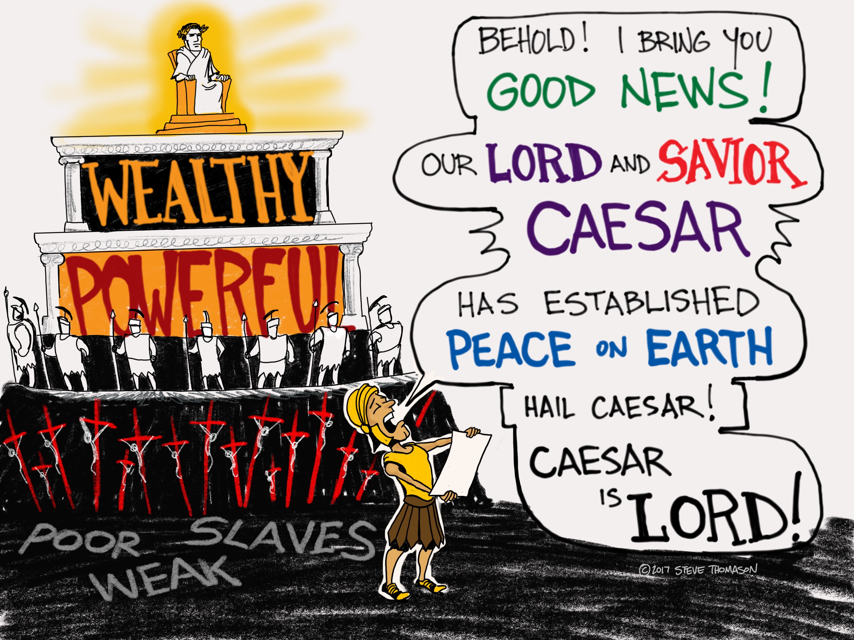 Caesar believed that he was the son of the gods and had brought peace to the earth through his military victories. This is called the Pax Romana (peace of Rome). The Roman Empire was built upon the philosophy of Aristotle that created a hierarchical system in the universe. The rich and powerful people were more virtuous than the poor and lowly. Some people inherently deserved power and fame, while others were born for servitude. The peace of Rome was established by the wealthy and powerful crushing the weak, the poor, and the enemy with cruelty and violence. For example, the Romans crucified 30.000 people on one day, because they were rising up against the Empire.