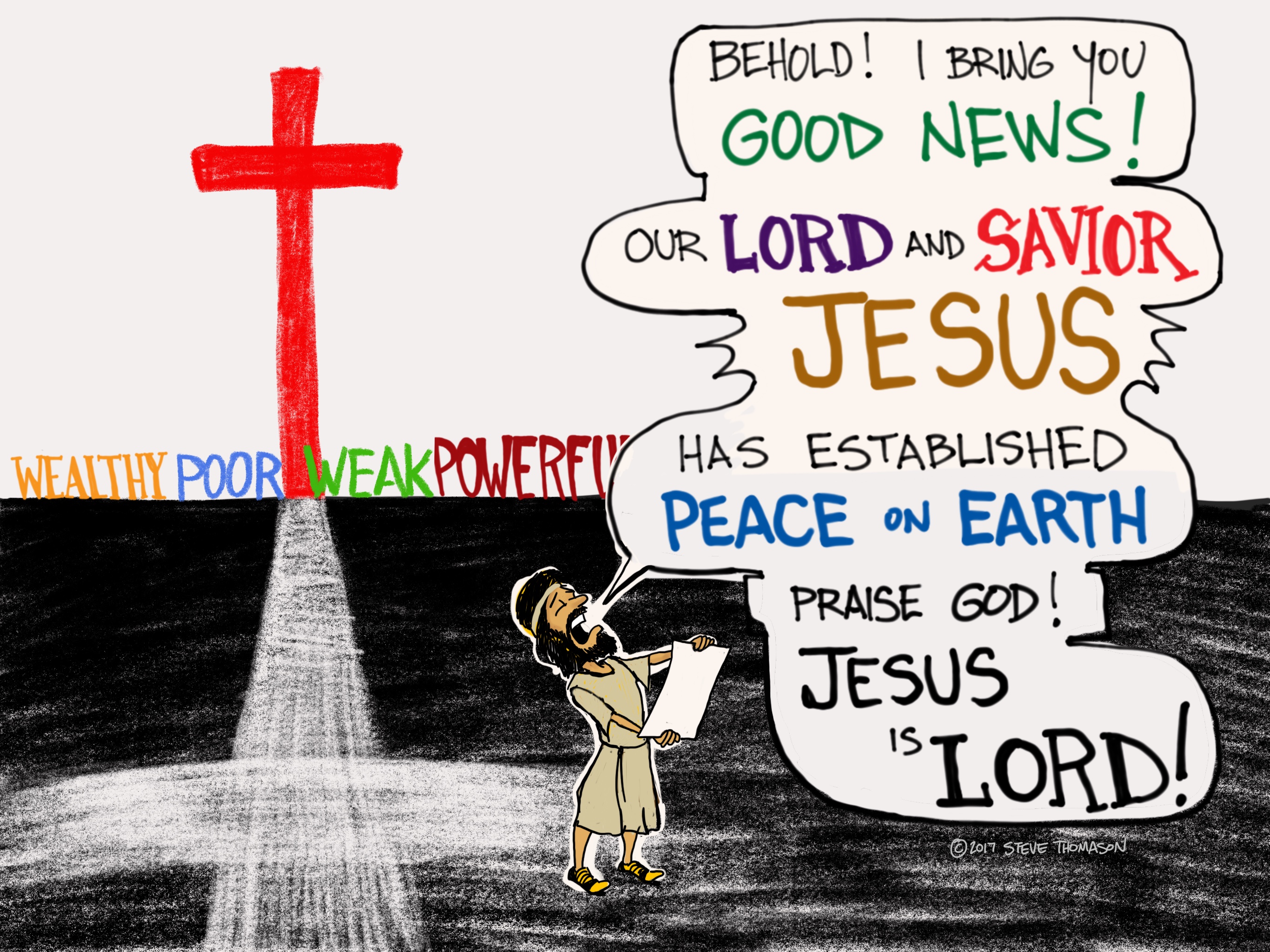 Jesus did not overthrow the violence and power of Rome with violence and power. Instead, he absorbed the violence of Rome on the Roman cross…and forgave it. He let it go. He took the more excellent way of love and his resurrection gives the hope of new life in a new way of being humanity. It is a way of Shalom, the peace of God on Earth, goodwill toward all people. It is a Kingdom where the wealthy and the poor, the weak and the powerful are all equally valued and work together for the common good.