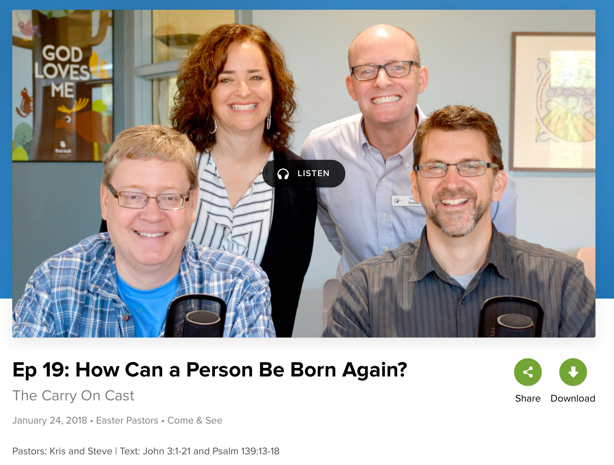 Did you know that the pastors of Easter Lutheran Church record a podcast every week? It is called Carry On, because our mission at Easter is to “Grow in faith and carry on the work of Jesus Christ.” It gets posted every Friday. We discuss the text and theme for the upcoming weekend of worship. And, we laugh a lot.