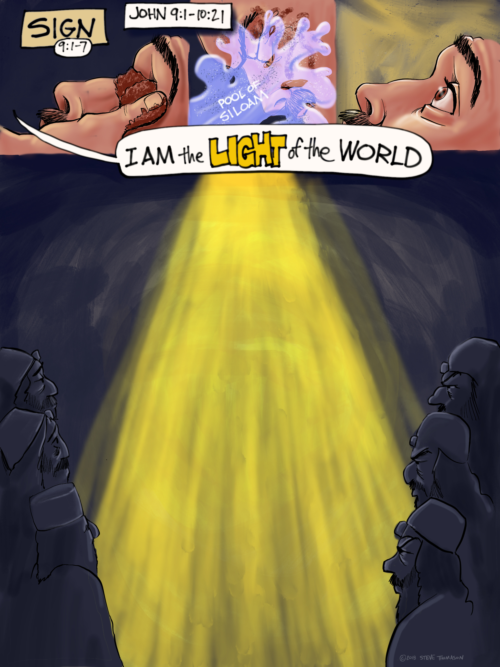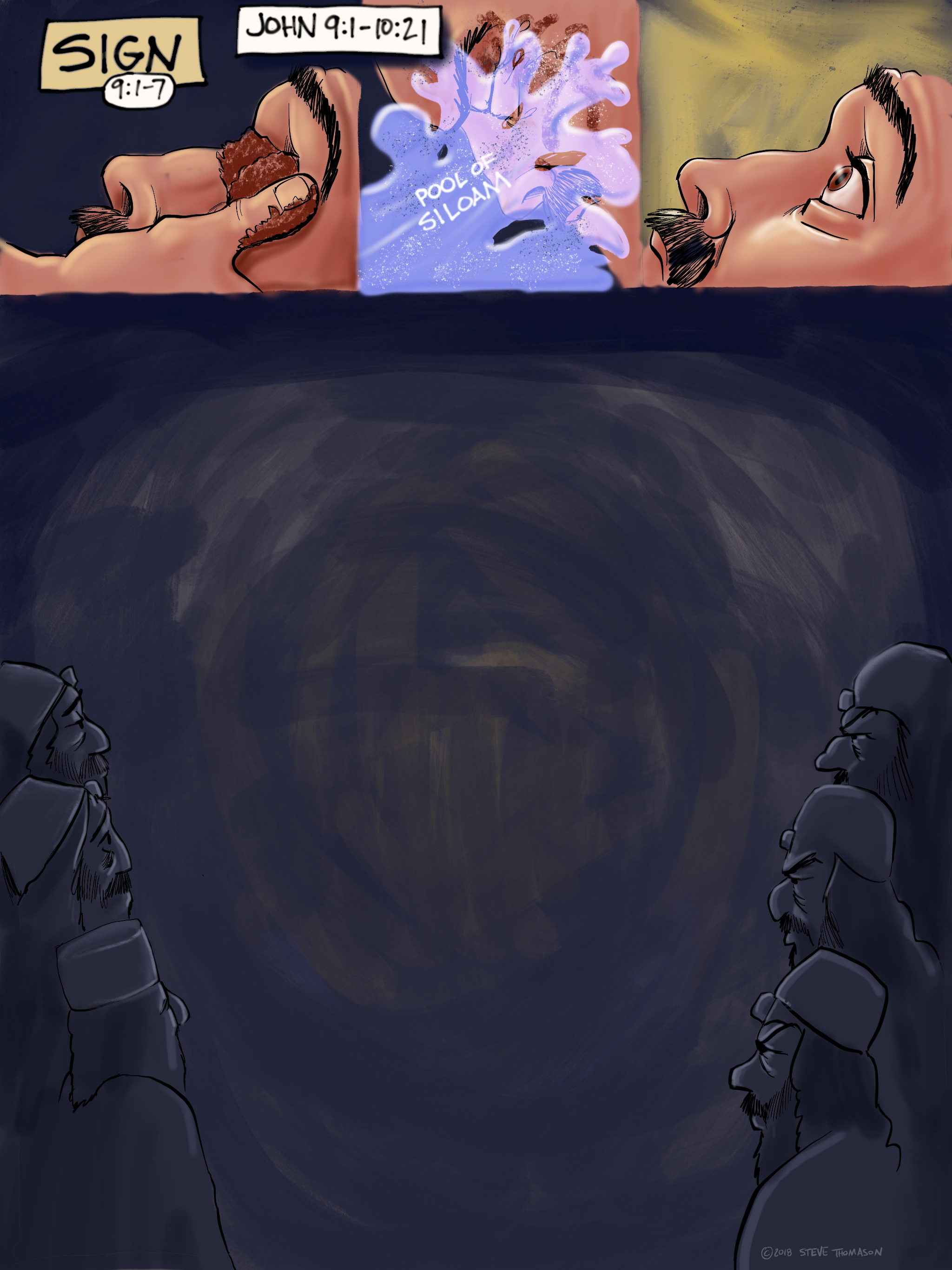 Jesus is the living water, and his spit turns dirt into life-giving mud. The blind man first hears Jesus’ voice, then obeys by washing in the pool of Siloam. Now he can see who has healed him. This is one of Jesus’ signs.