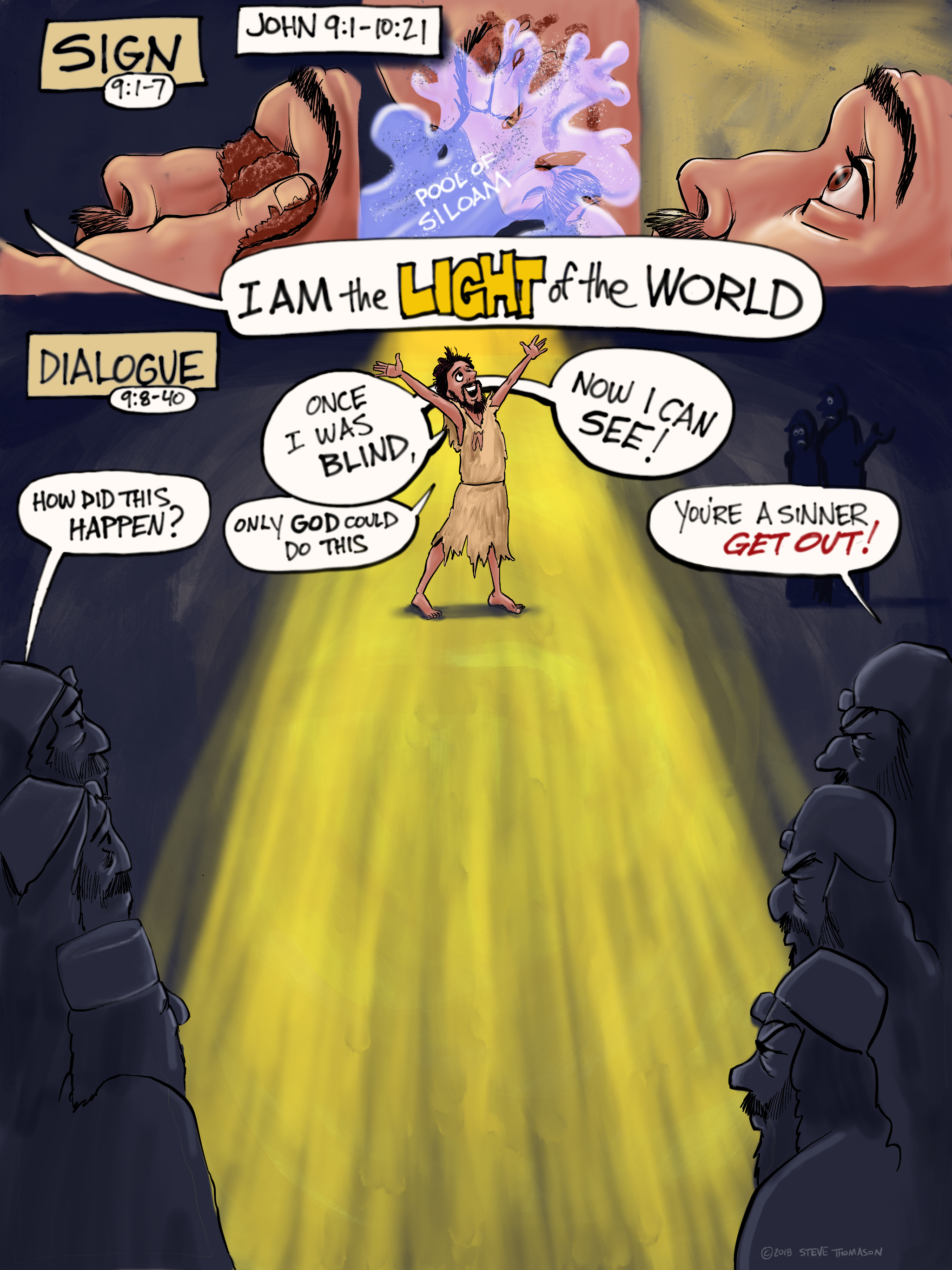 John 9:8-40 records the dialogue that follows and surrounds the sign. The religious leaders are upset that Jesus performs this sign on the Sabbath day. The interrogate the man and his parents. The parents hide in the shadow of fear. The man boldly testifies to what Jesus has done. The leaders can only see him as a sinner and cast him out.