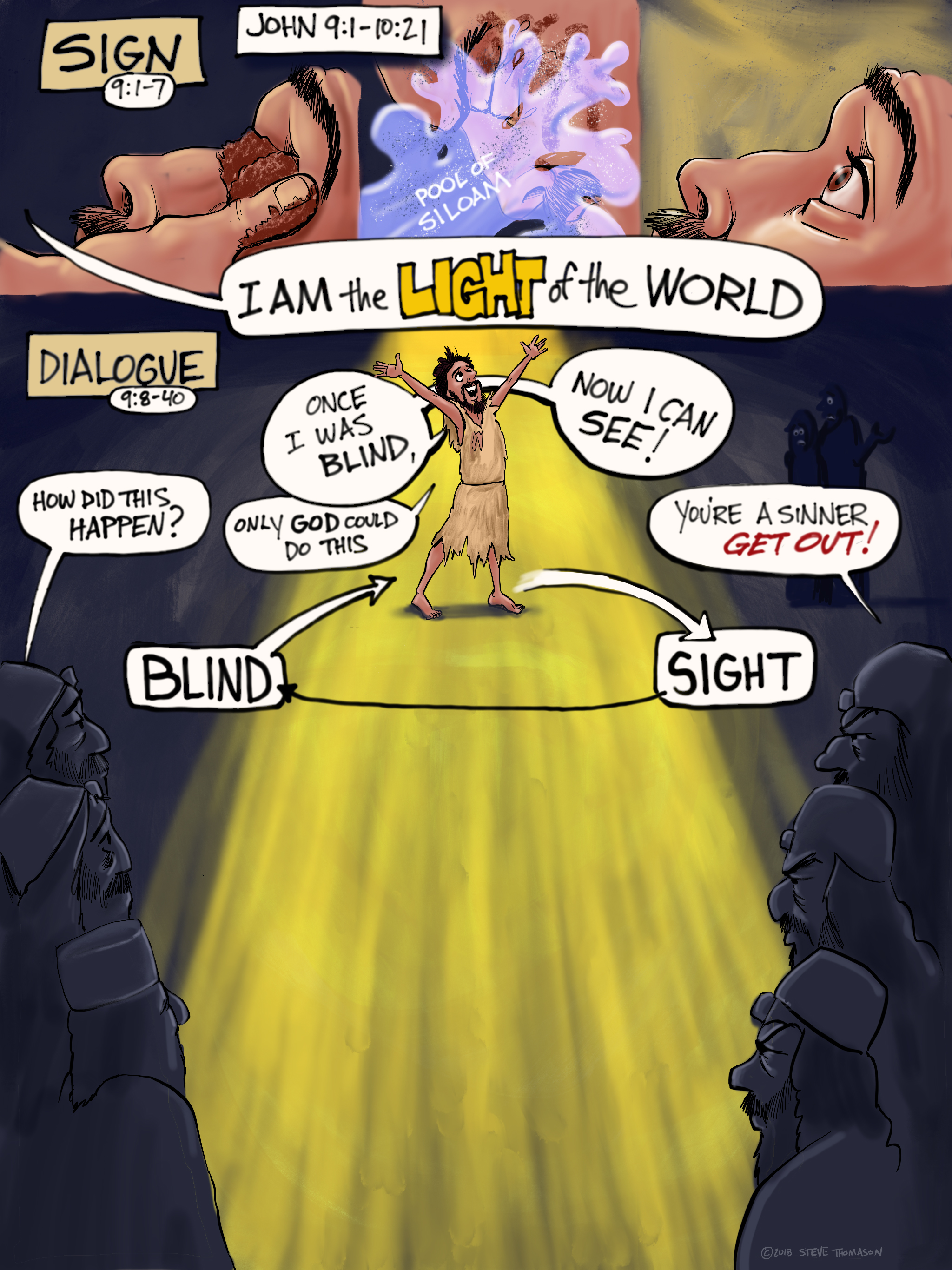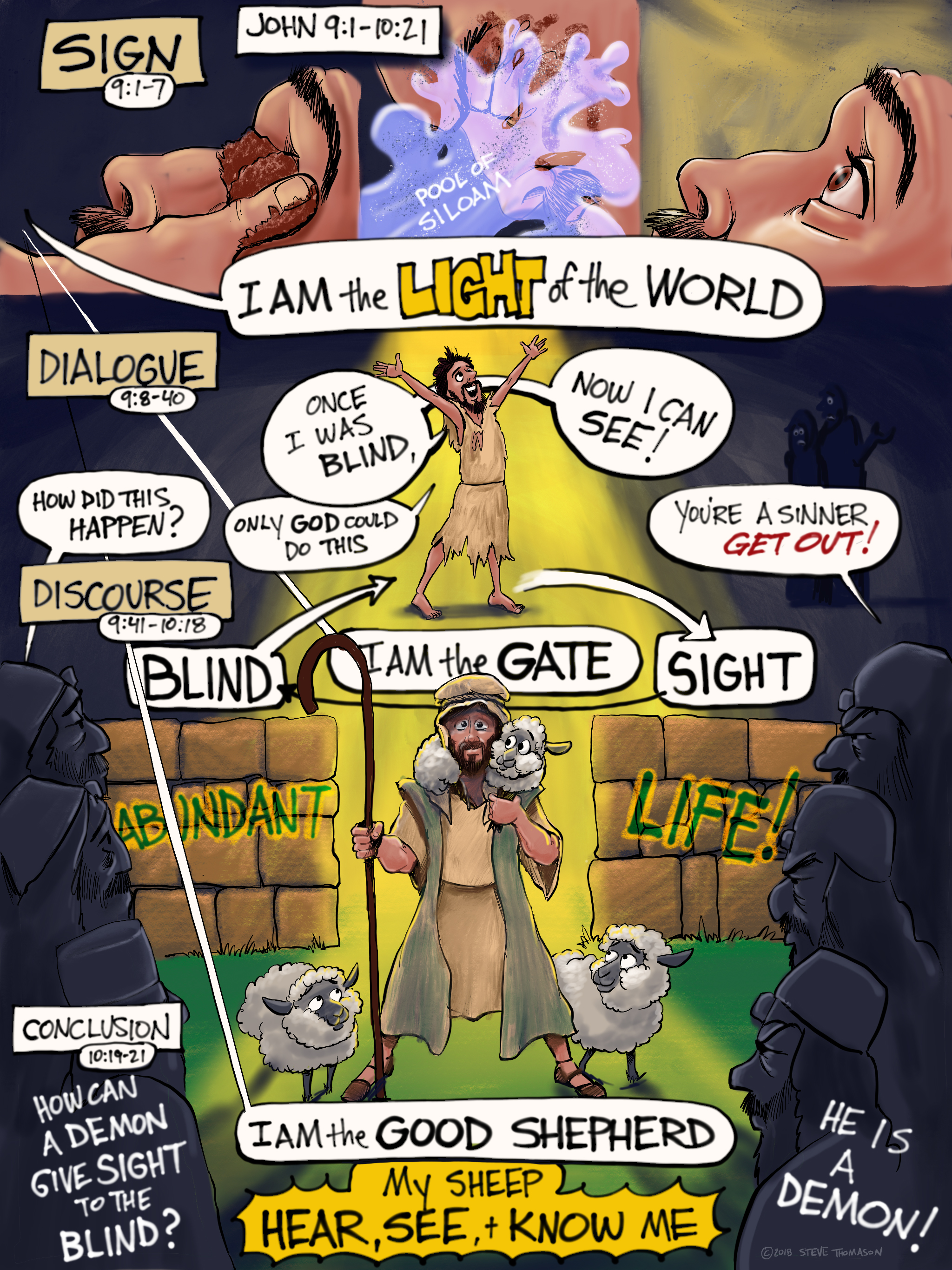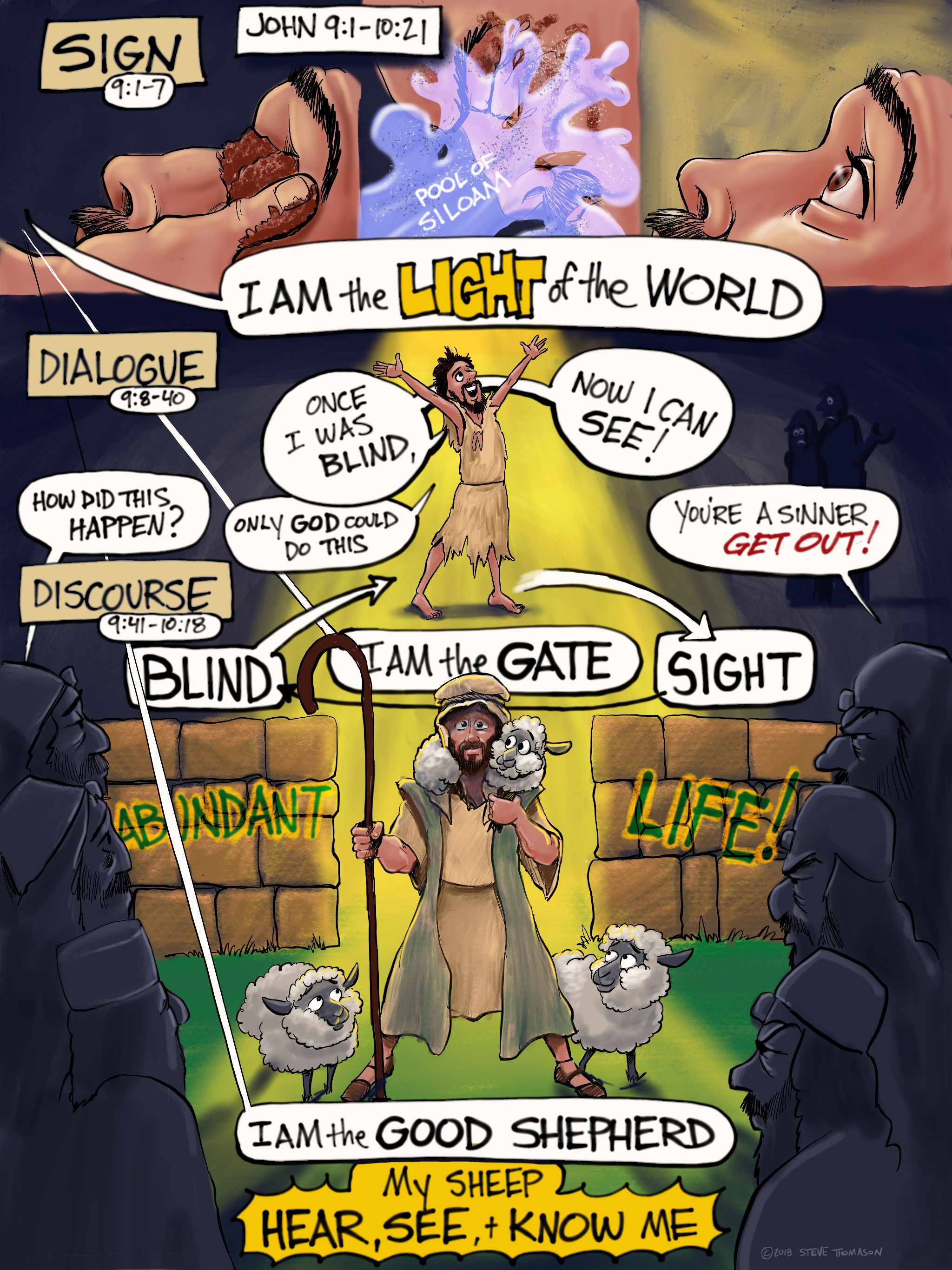 The following images will walk through John 9:1-10:21. This is the text from the Narrative Lectionary for this coming weekend. It tells the story of the sign Jesus gave by healing the man born blind. This sign points to the fact that Jesus is the Light of the World, the Gate for the Sheep, and the Shepherd whose voice the Sheep know and follow. Feel free to use these images in your teaching and preaching.