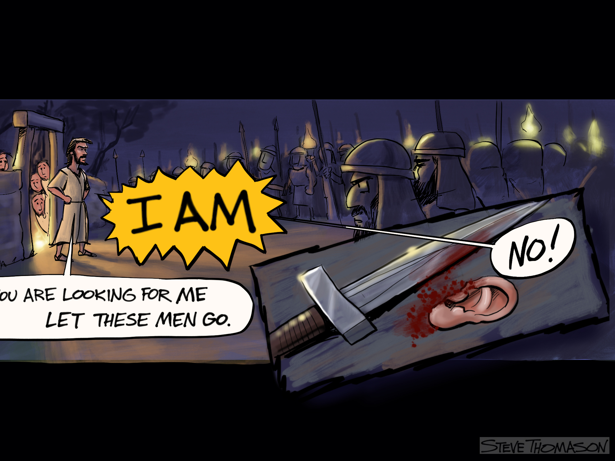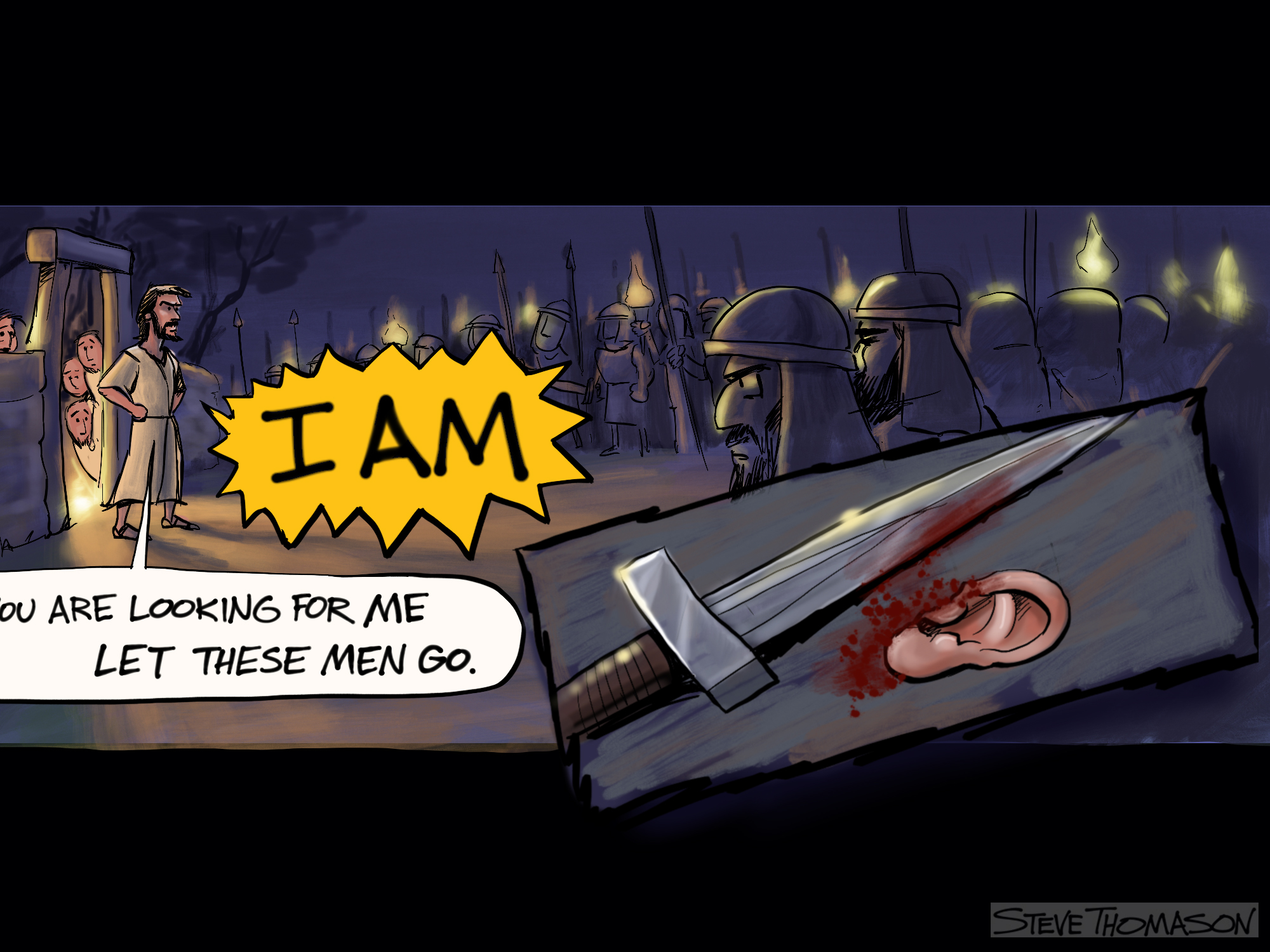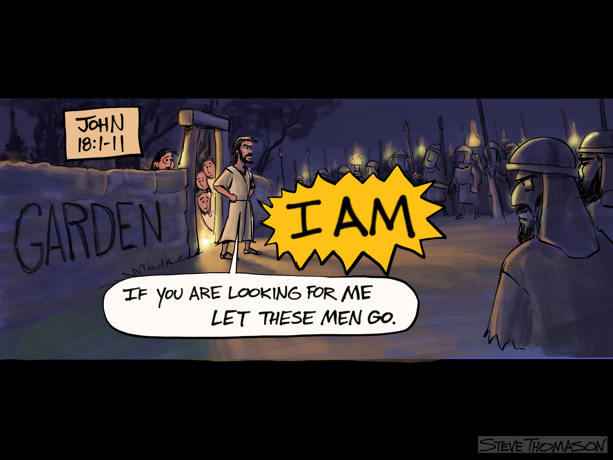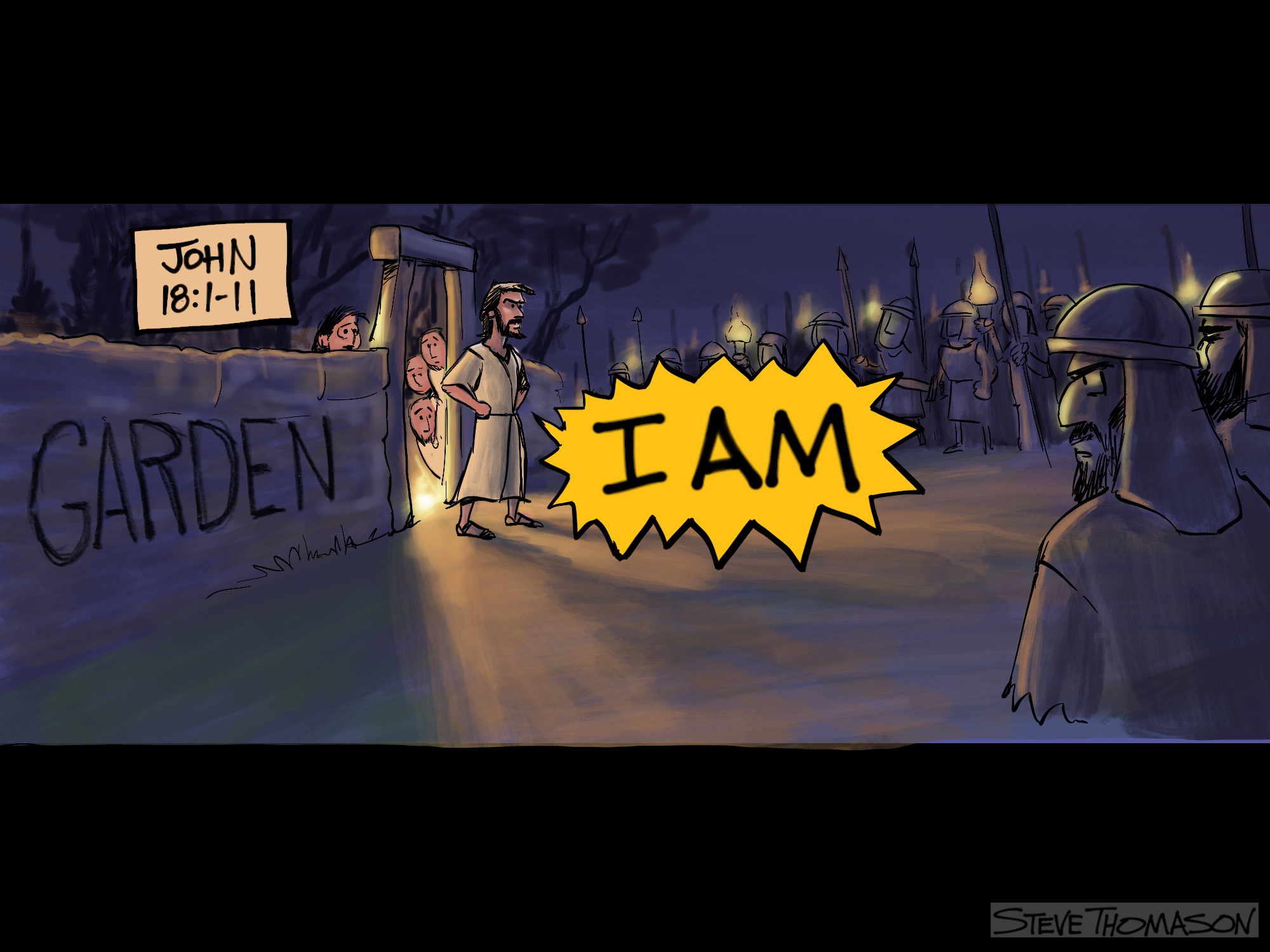 “Whom are you looking for?” Jesus asks. “Jesus of Nazareth,” they say. He answers, “I AM” and they all get knocked on their butts. This is Jesus’ ultimate “I AM” statement.