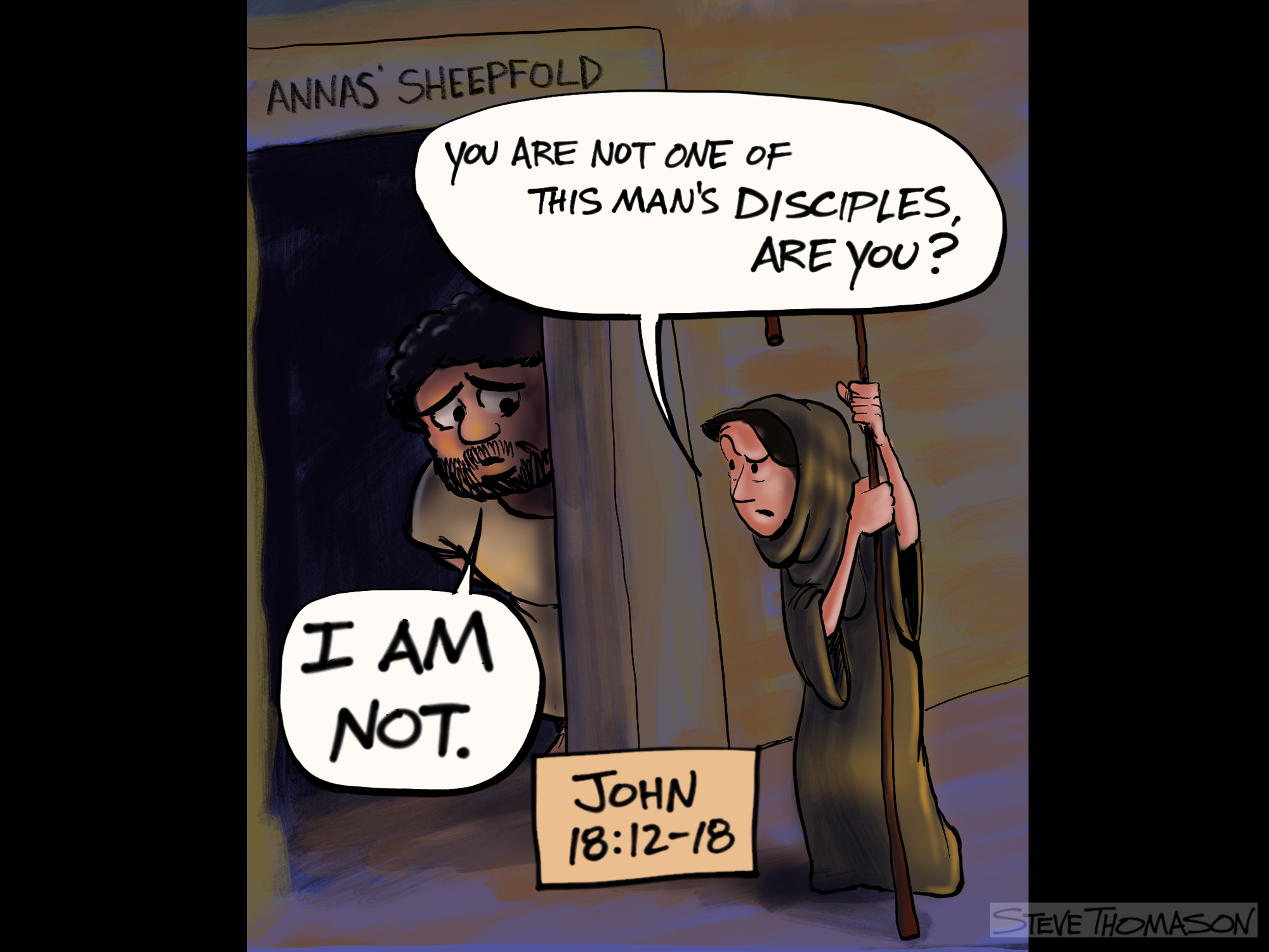 The term courtyard is the same greek term translated sheepfold. The woman is the gatekeeper (same as the Good Shepherd in John 10) for Annas’ sheepfold. “Are you a disciple?” she asks Peter. This is the ultimate question for all of us. When the going gets tough, do you believe? Are you in relationship with Jesus? Do you stand in his sheepfold? Or, are you like Judas who has completely left the fold. Peter is not in the fold at this moment.
