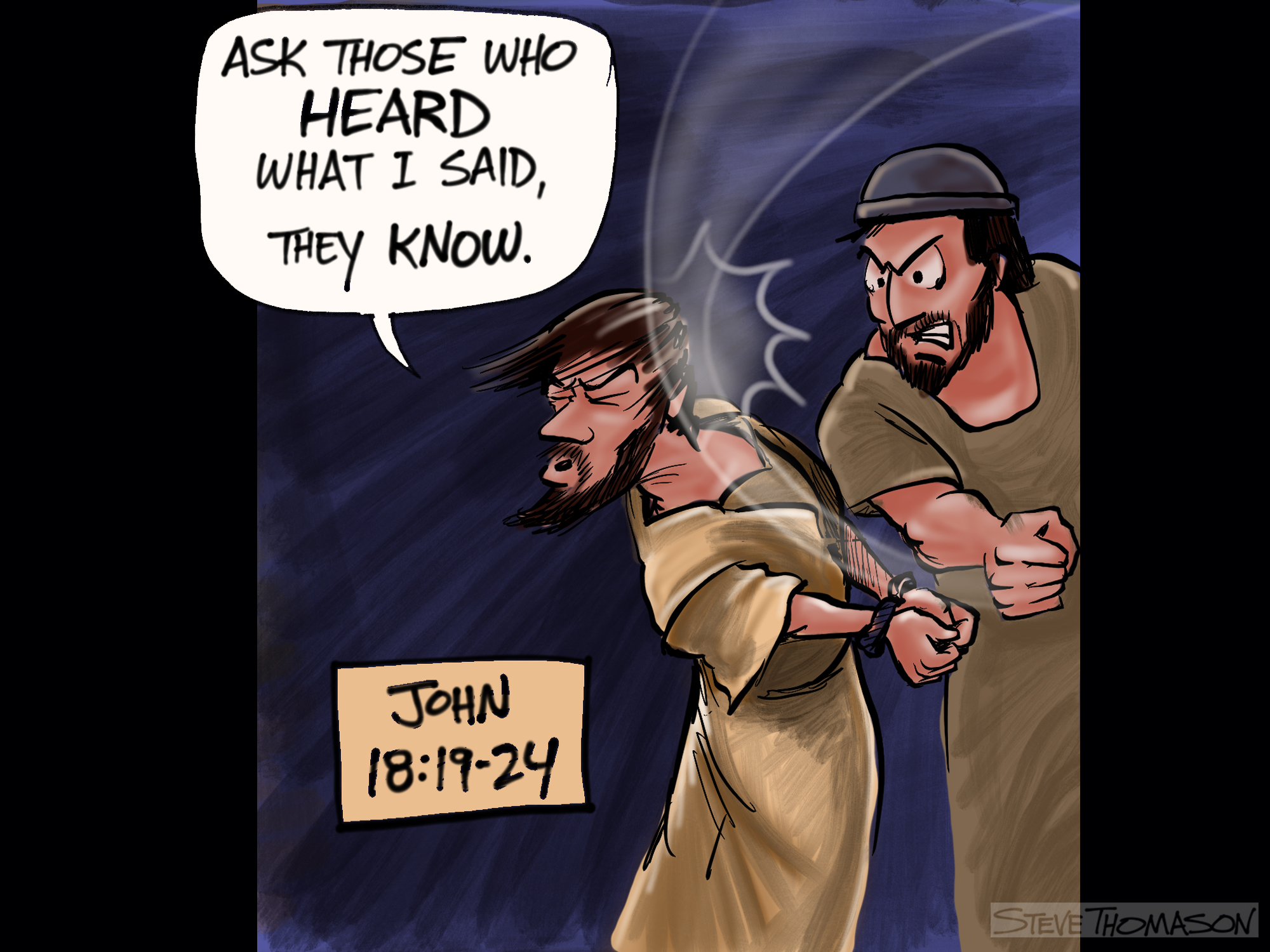 Jesus’ words are significant here. His interrogators ask him to explain the actions of his disciples and his teaching. His response is to note the he has spoken publicly and those who HEARD him KNOW what he is about. The sheep hear his voice and know him, thus they follow him. Jesus’ answer was not well received. He is sent on to Caiaphas.