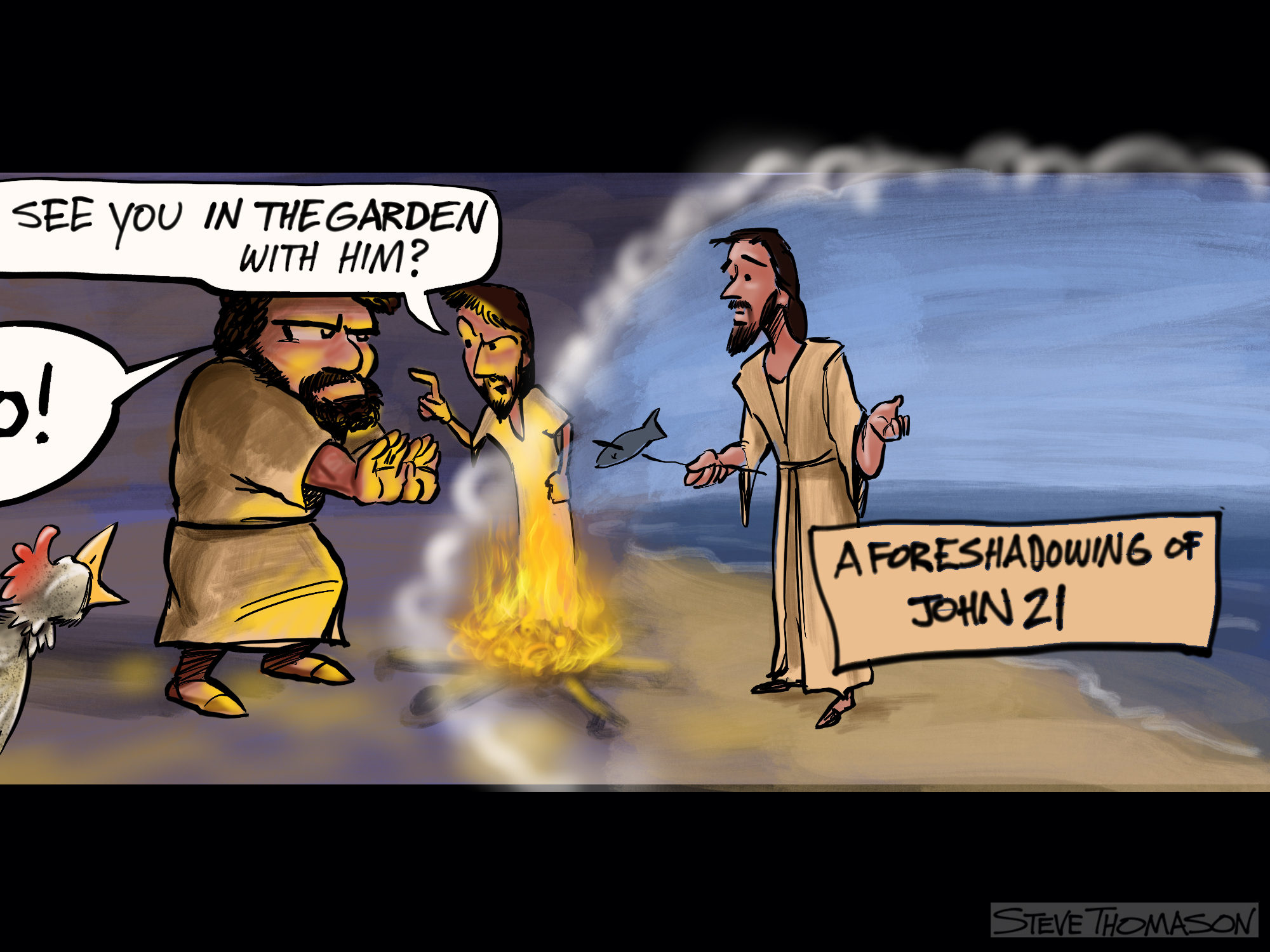 The charcoal fire is significant. It foreshadows another fire that comes at the end of the story. Peter has withdrawn himself from Jesus in Jesus’ darkest hour. That is true. After Jesus’ death and resurrection, Jesus meets Peter on the beach and makes a charcoal fire. He cooks him breakfast and invites him back into the loving relationship they once had.