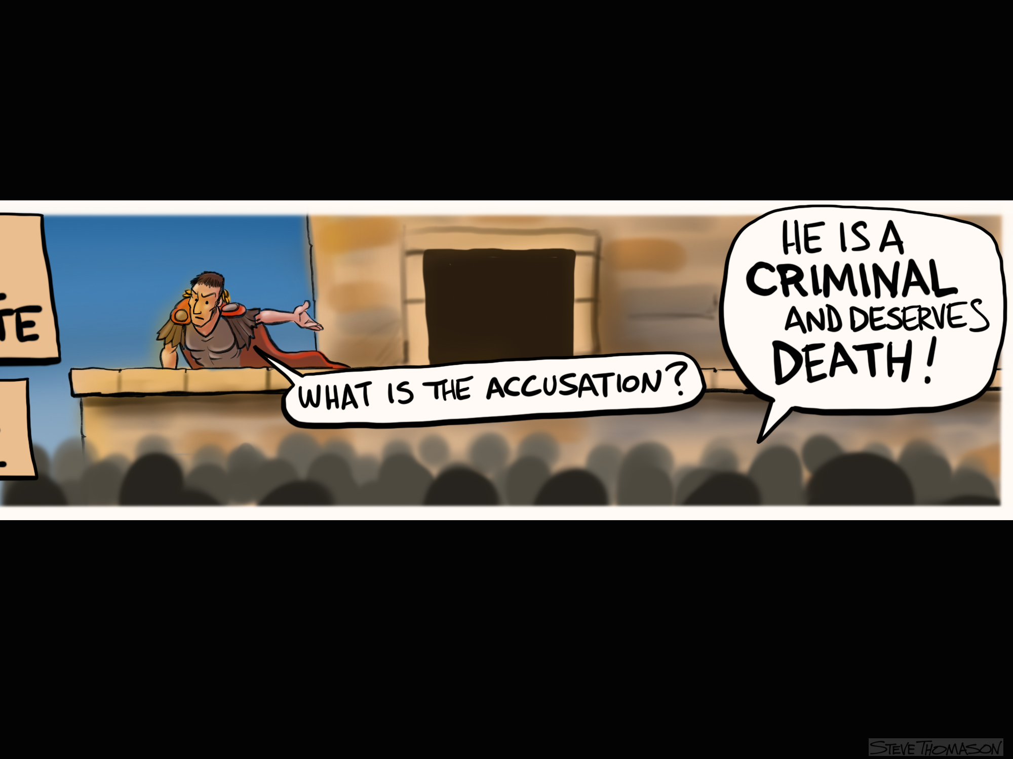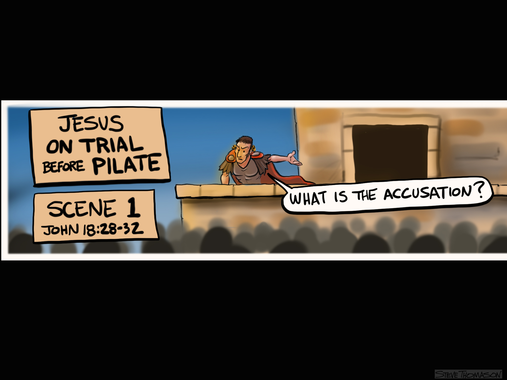 The Jewish leaders and the crowd stand outside Pilate’s headquarters. They dare not enter or else that would become unclean and not able to participate in the Passover.