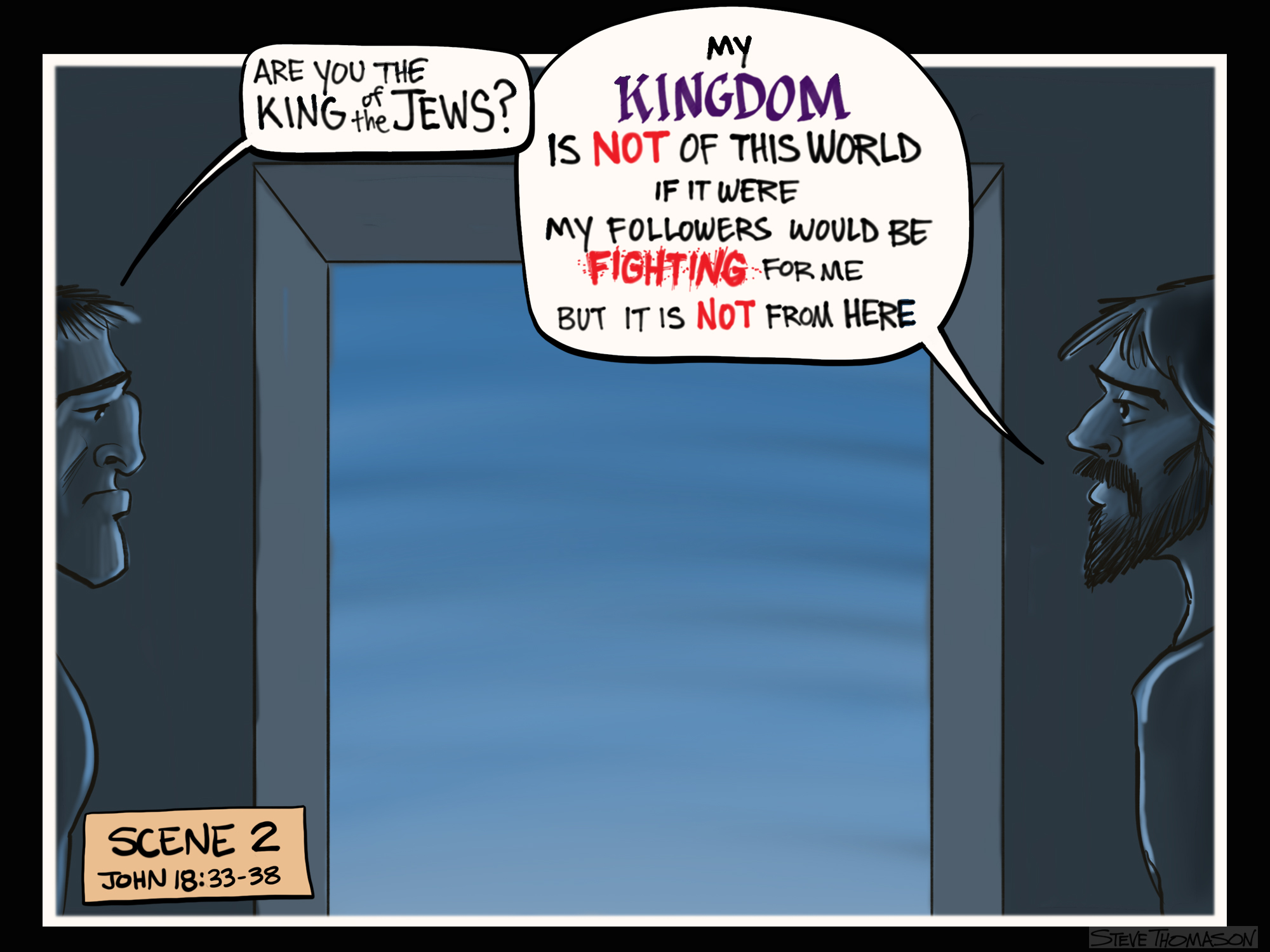 This is not about earth vs. extra terrestrial or pie-in-the-sky. The world represents the human systems of power and violence. Jesus’ mission is to bring the kingdom of God to replace the kingdom of man, in the same physical space. If Jesus’ kingdom was like the world’s, then his followers would be fighting. That’s not how Jesus rolls.