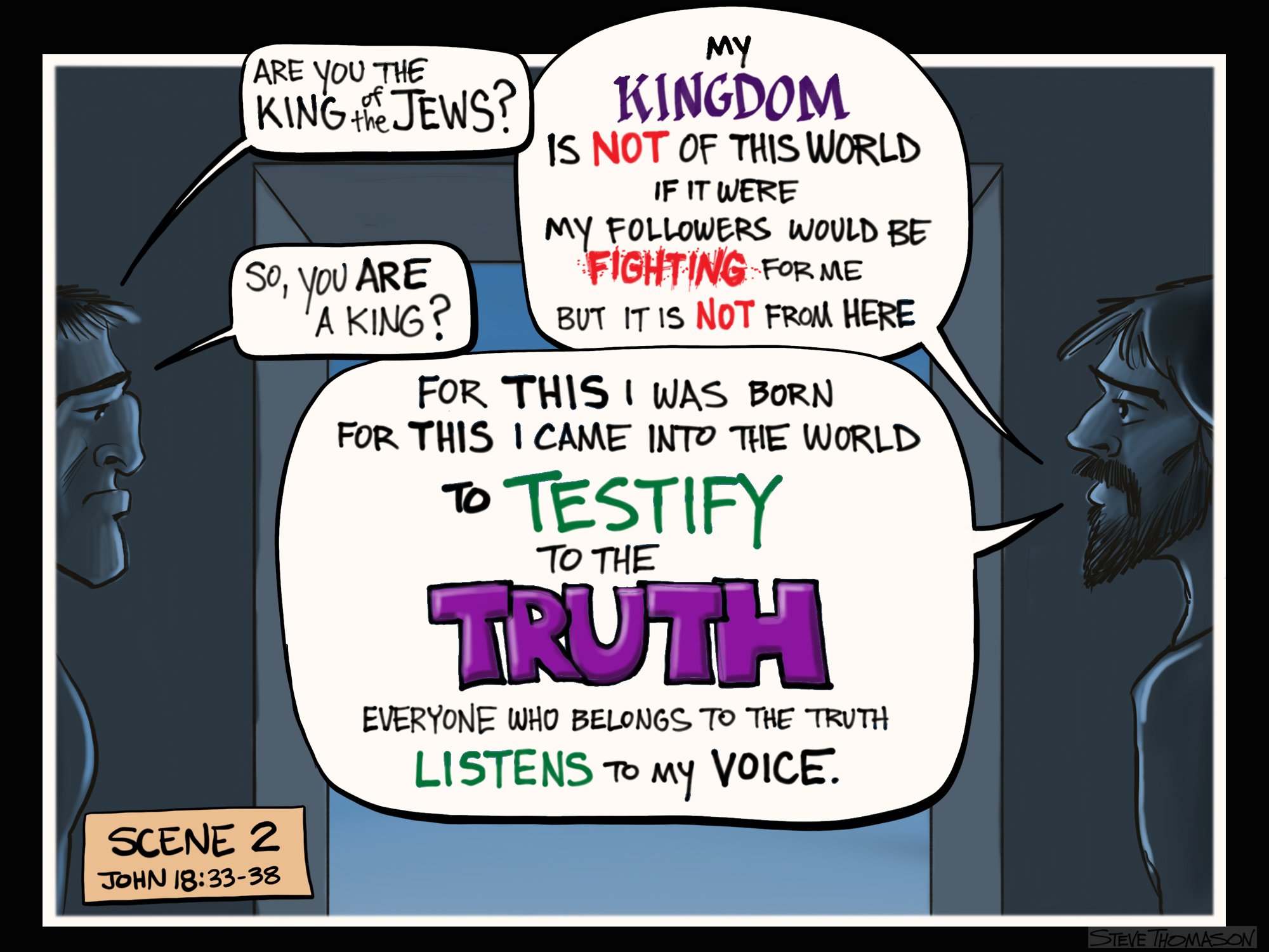 Jesus neither confirms nor denies that he is a king. He simply states that he testifies to the truth.