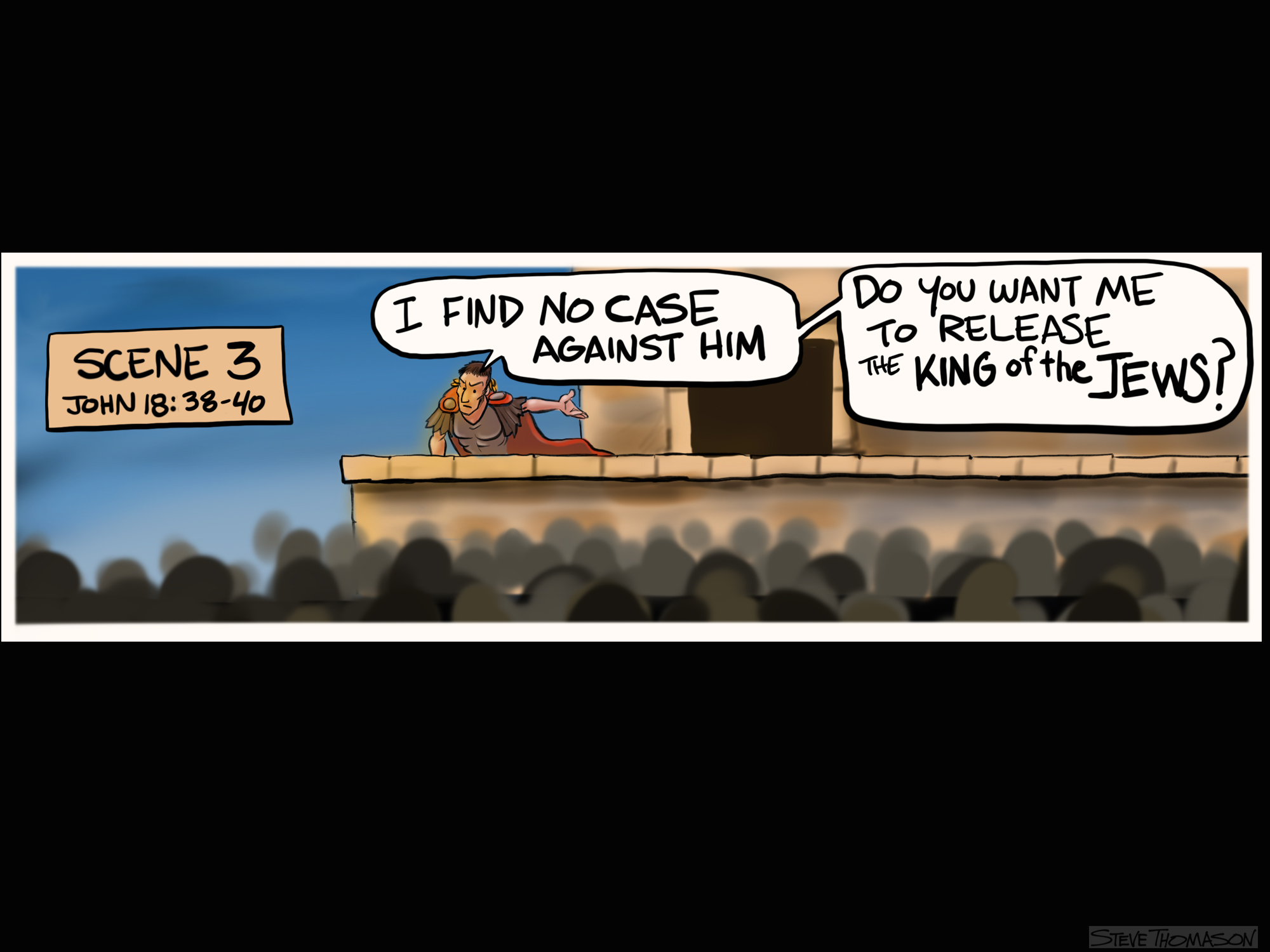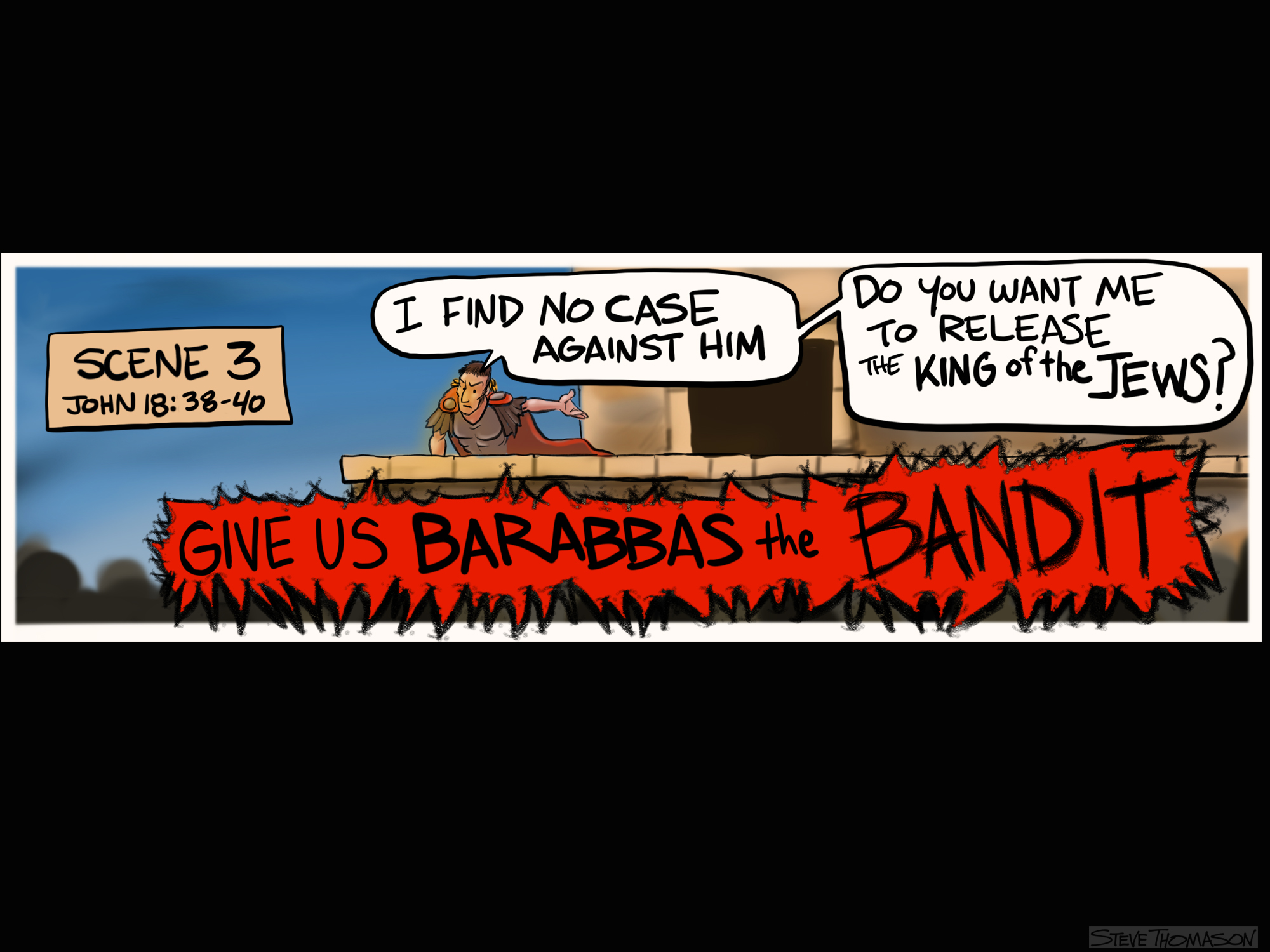 The leaders don’t want Jesus. They would rather have a bandit. This scene, once again, goes back to John 10 and Jesus’ claim to be the Good Shepherd. The sheep hear his voice and follow him. The thieves jump the wall and steal the sheep.