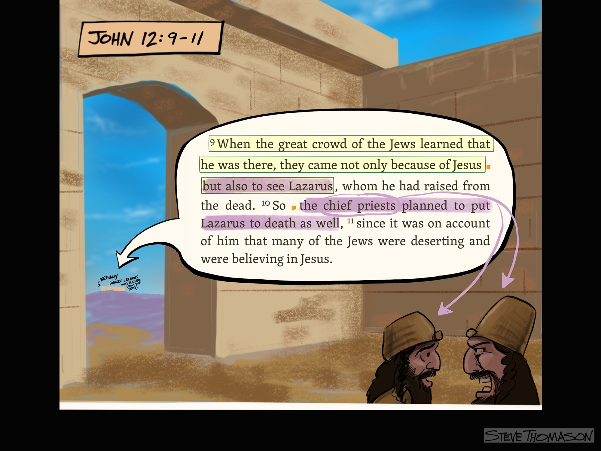 John 12:9-11. Lazarus’ resurrection is what ignites this whole firestorm.