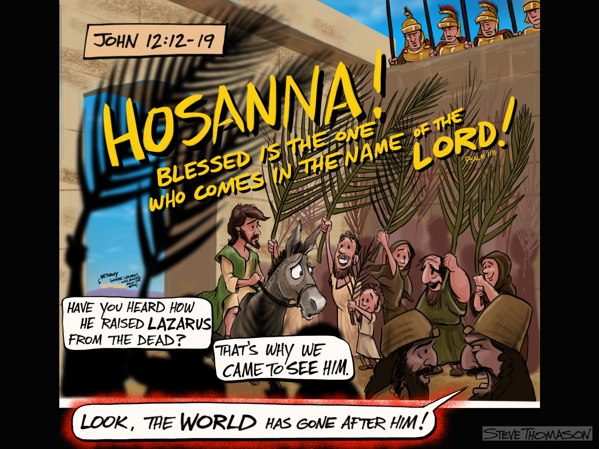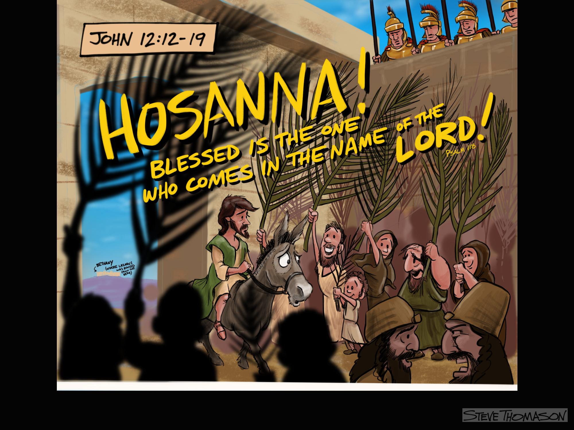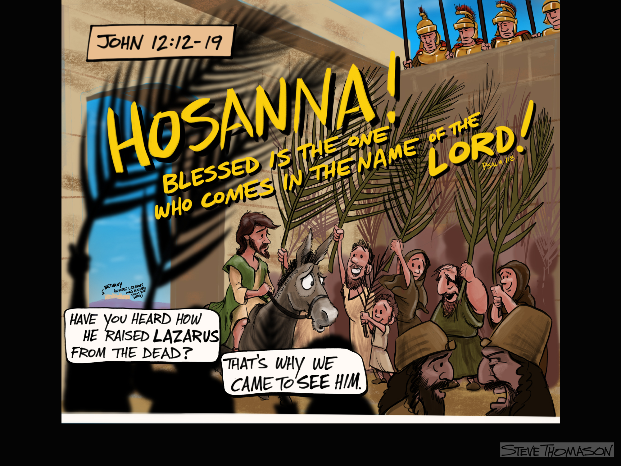 John 12:12-13. Palm branches were the symbol of victory. The crowd sings Psalm 118:26 (probably the whole Psalm, actually). They expect that Jesus will be the new King who brings victory over the Romans. Pilate’s soldiers are ready for battle (that’s my insertion. The text doesn’t say that).