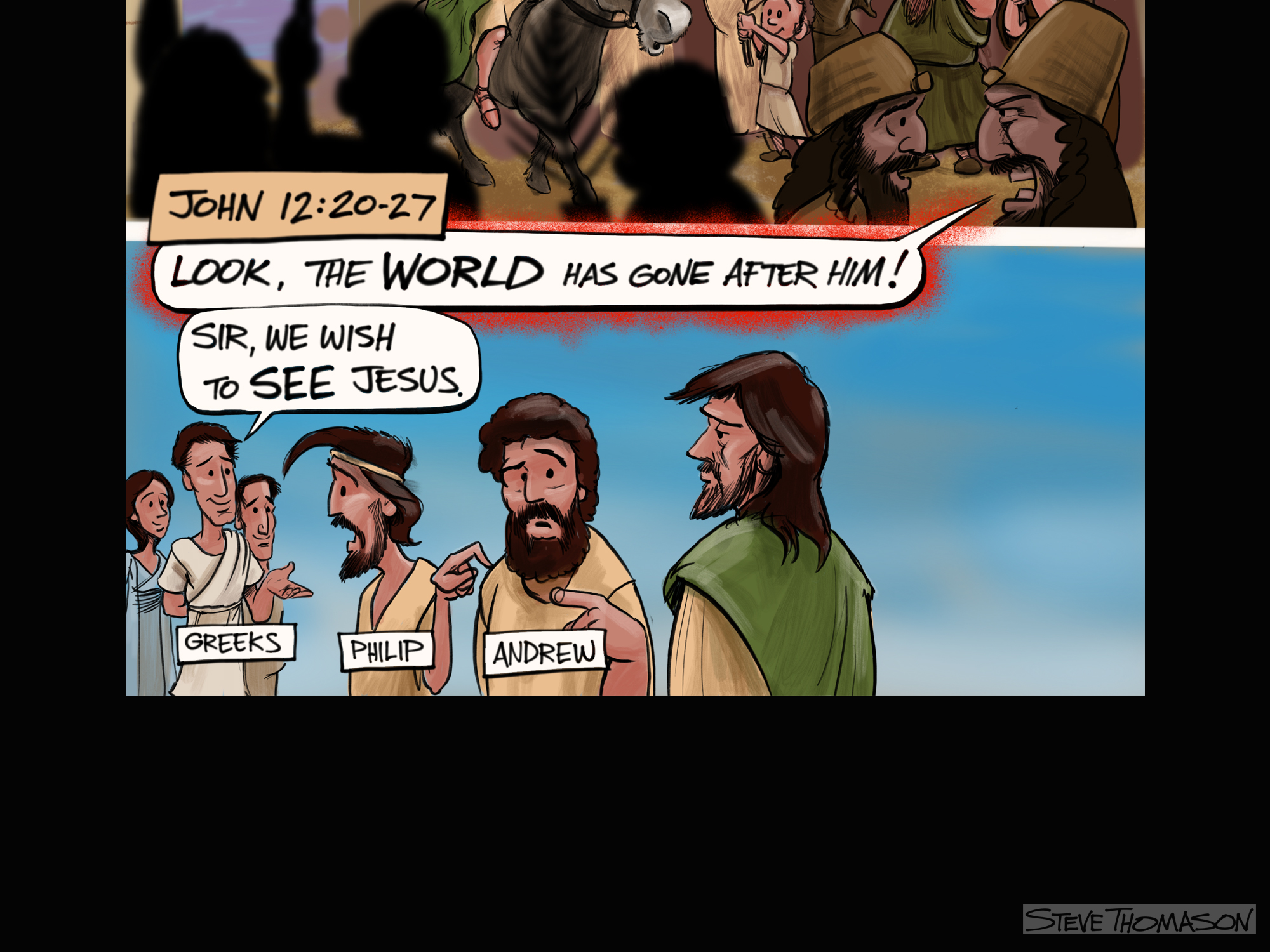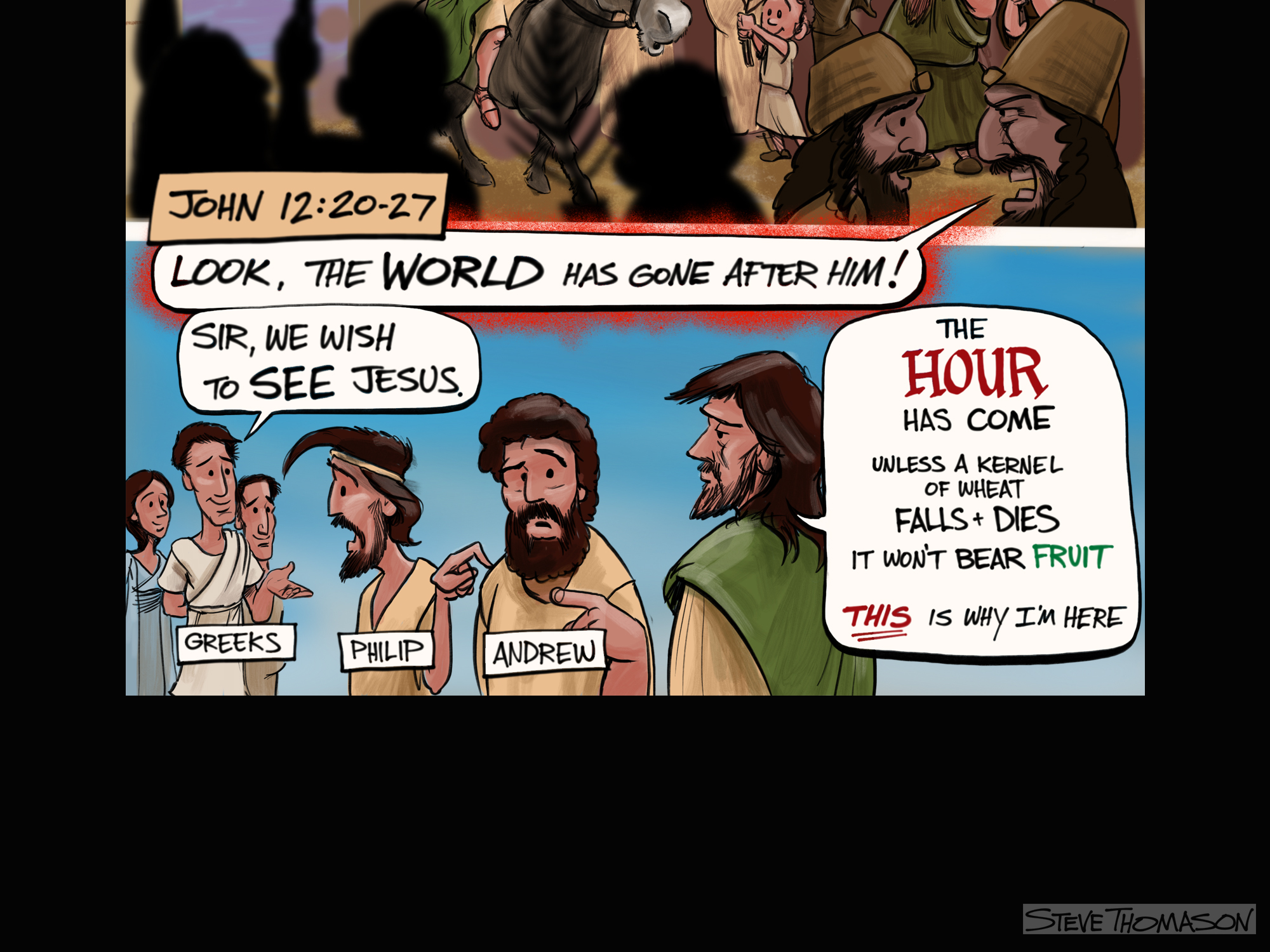 John 12:20-22. John gives us a word play. The leaders mention the World, and who walks up; a bunch of Greeks. This scene takes us back to John 1:35-51 where Jesus calls these same disciples. They want to see where Jesus abides, and he says, “Come and See.” Now, the world is coming to the disciples, because they, too, want to see where Jesus abides.