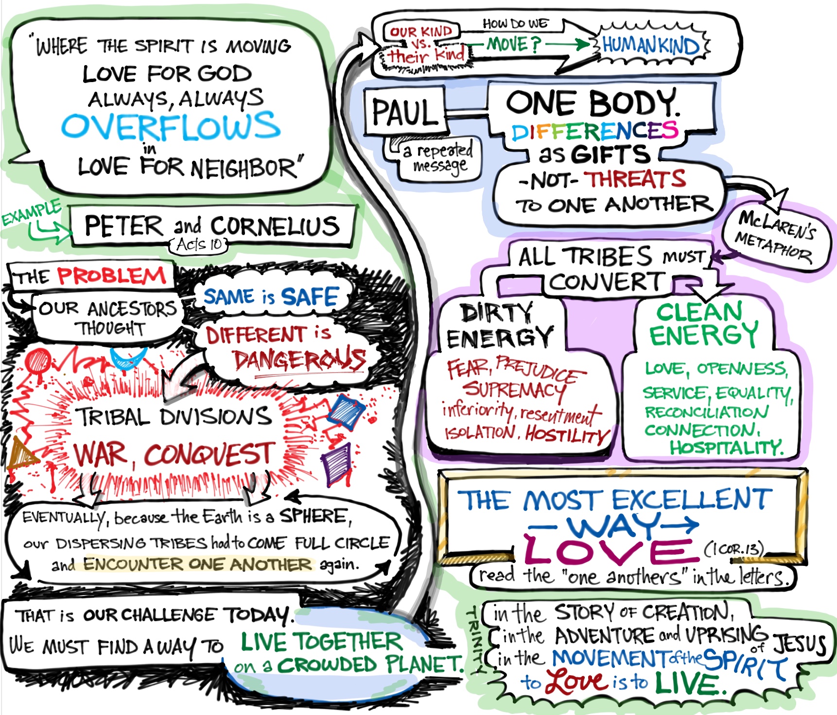 Our sermon this weekend is part of the Alive Series and is based on Brian McLaren’s book We Make the Road by Walking, specifically chapter 43. It is titled Spirit of Love: Loving Neighbor. The chapter is so good that I decided to create a visual outline of it to help me internalize its message. It will be interesting to see how much of the sermon reflects this map. Enjoy!