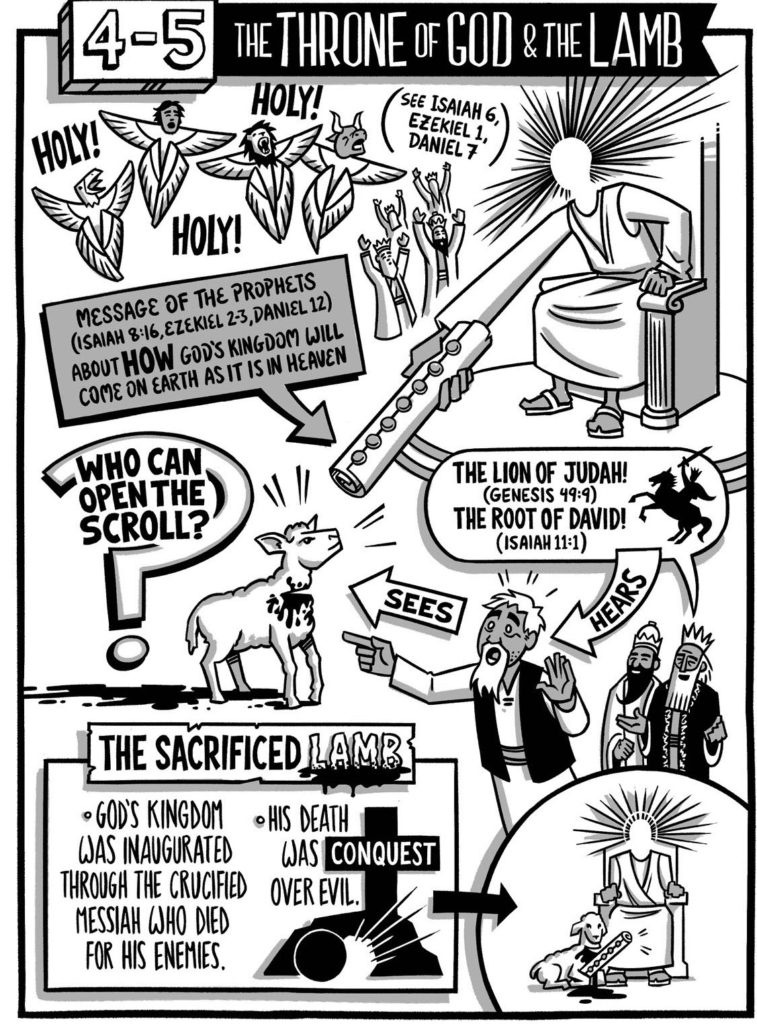 Notice how Jesus is the lamb that was slain in the beginning of the story. The fact that he gave his life for the whole world, even his enemies, is what makes him worthy to open the scroll. [divider]