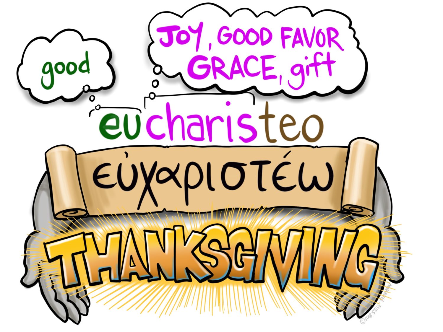 I offer the illustration above as a visual meditation on the Greek word that we translate giving thanks. It is the word used when the one Samaritan leper returns to thank Jesus for healing him in Luke 17:16. It is also the word used when Jesus took the bread and the cup and eucharisteo, he gave thanks at the Last Supper (that’s why it’s called the Eucharist).