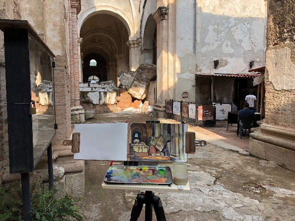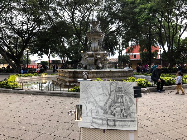 I love painting plen air (that is a fancy term for painting outside, on location, and really fast) for many reasons. One reason is because drawing and painting is a form of meditation for me. It forces me to slow down, focus, and become really present in a particular place. Another reason is that it allows me to connect to people in a unique way. Ever since I was a child I have always used art to connect to people. I was very shy and we moved around a lot. Whenever I would come to a new school I would start drawing and kids would gather around. Art has always been my “hand shake” for human connection. When I set up in a busy place people inevitably stop to watch and often talk to me. They ask questions and make comments. I got to meet some cool people today. I suppose these past two days of sketching have been my “handshake” to Antigua.