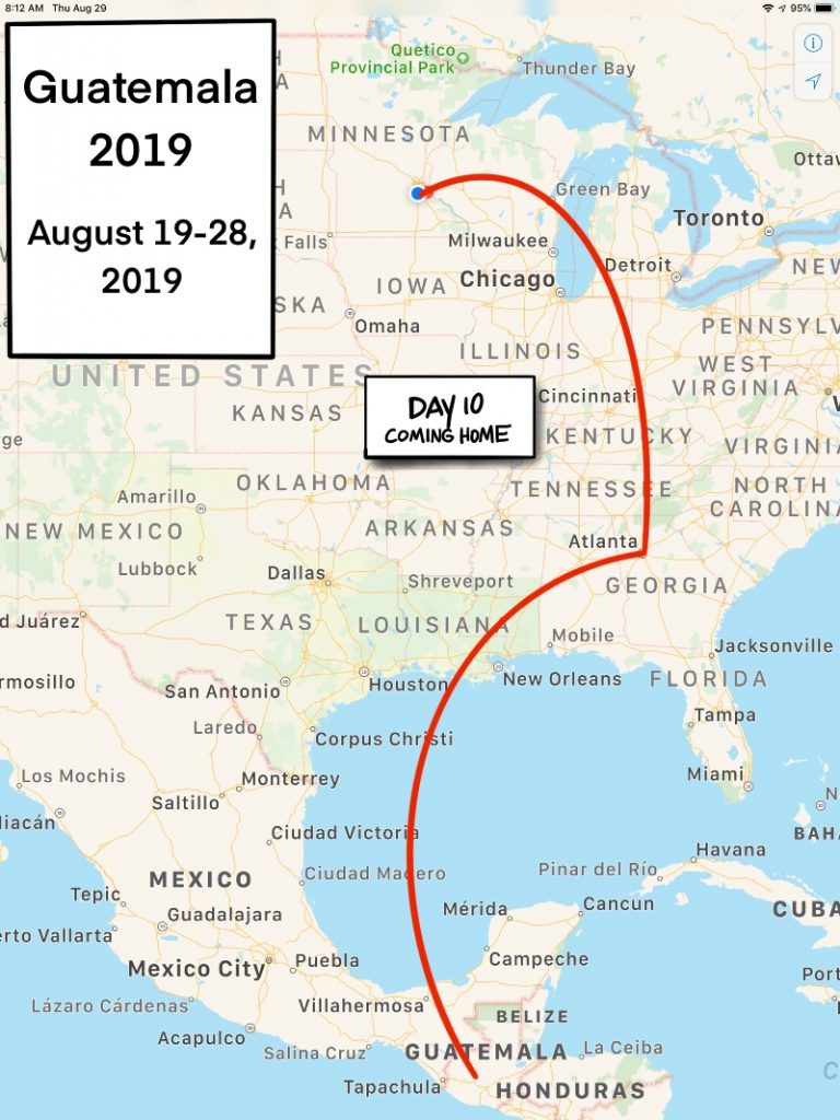 The delegation spent yesterday traveling. We had a leisurely morning at the Lutheran Center, eating up all the leftovers for breakfast. Diego and Estuardo took us to the airport at 10:45 and we began our re-entry into United States culture. The flight to Atlanta took three hours (got a movie in). We had a three hour layover, so the whole team shared a last supper at TGIFridays at the airport. The flight to Minneapolis took a little over two hours. We landed at midnight and I got home around 1am.