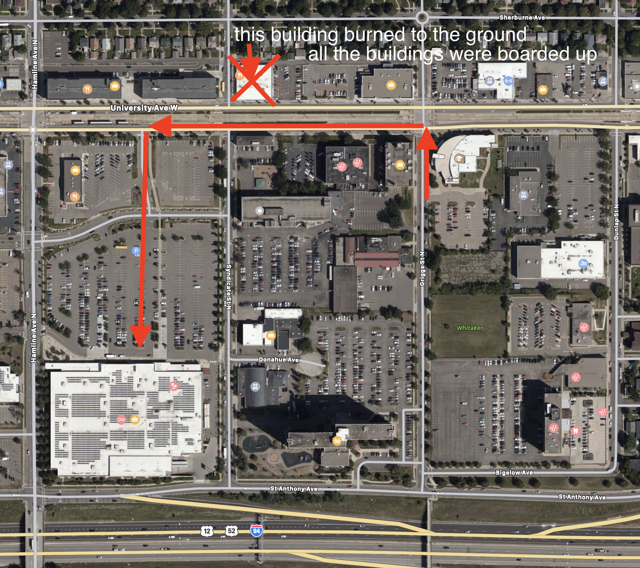 We walked past all the stores that were boarded up. One building—Bole Ethiopian Cuisine—was burned to the ground, reduced to a pile of rubble and twisted metal.