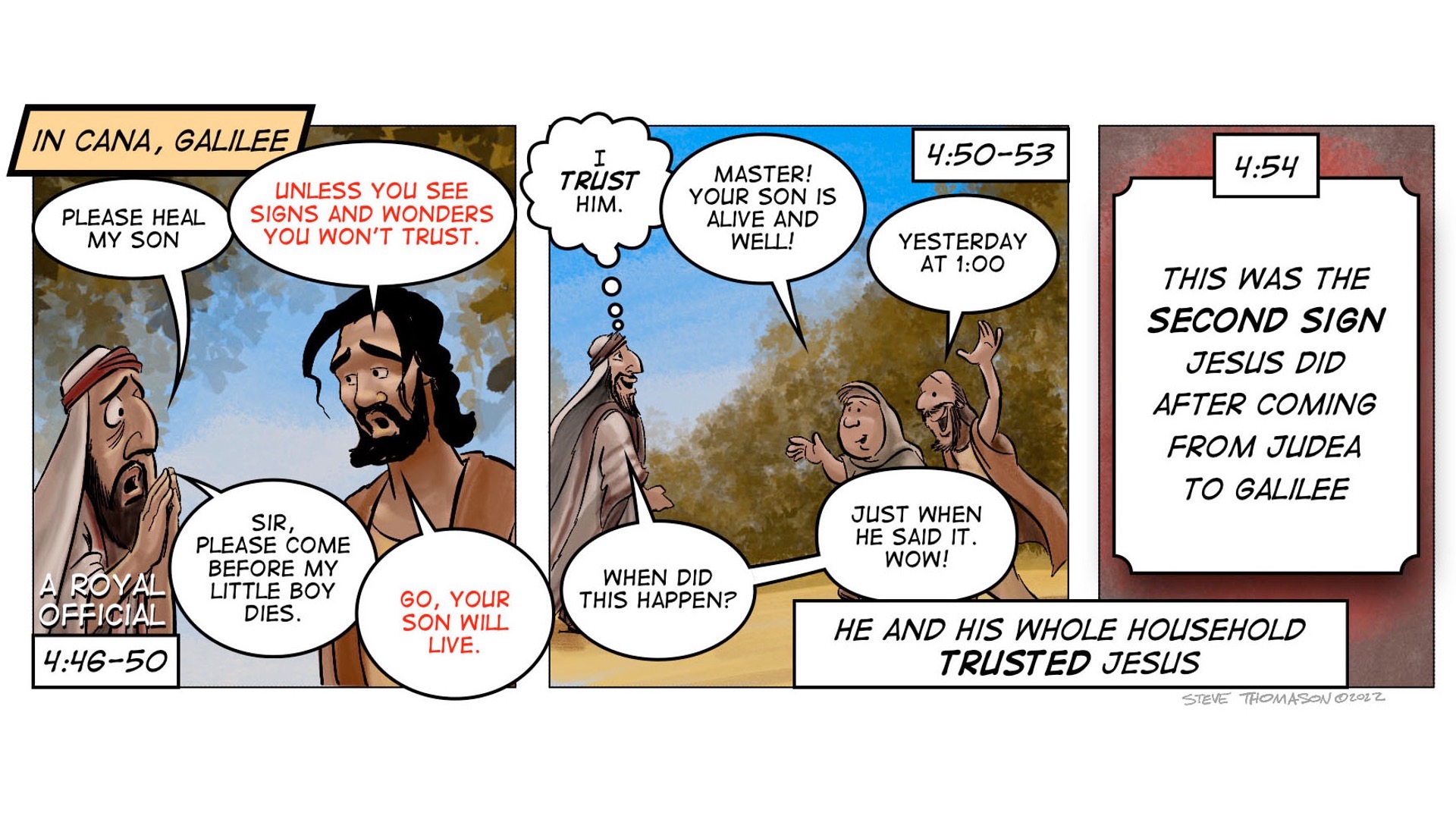 Yet, he trusts Jesus so completely that he believes he can heal his son long distance. That’s exactly what Jesus does. The man’s entire household trusted Jesus.