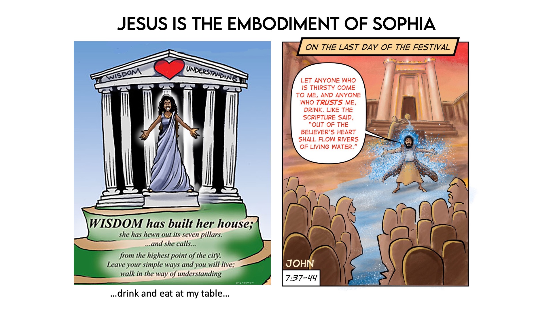 Elizabeth Johnson makes the claim that Jesus is the embodiment of Sophia, or Lady Wisdom as she is depicted in the Hebrew Scripture. I created the image above when I preached on John 7:37-44. Jesus stood in front of the Temple on the last day of the Feast of Tabernacles and cried out to the people, just like Sophia did in Proverbs. (see the full visual commentary on John 7 here)