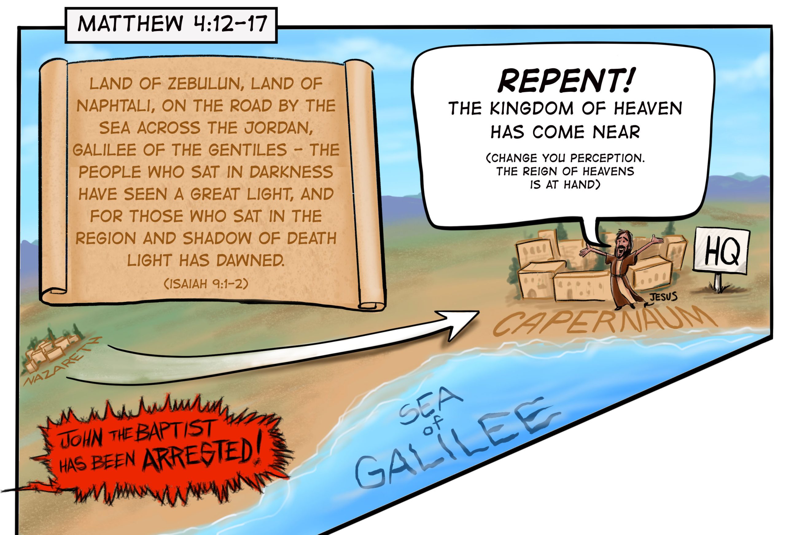 This week the Revised Common Lectionary takes us to Matthew 4:12-23. Jesus hears that John has been imprisoned. This prompts him to move to the fishing village of Capernaum and start preaching the same message that John preached, “Repent, for the kingdom of heaven has come near.” This, once again, fulfills the words of the Hebrew prophet, Isaiah, and exalts the land of Galilee where Jesus will spend the next three years preaching and healing the people. Then Jesus calls his first disciples, begins healing people, and his fame spreads and draws a huge crowd.