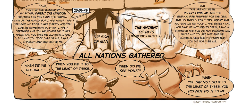I added a throne to this image based on Daniel’s vision of the Son of Man (Daniel 7:1-14). These images give a visual commentary on the passage. It is important to note that this is a judgment of all nations. The boundaries between Jew and Gentile are erased. All that matters is how the nations treat the “least of these.”