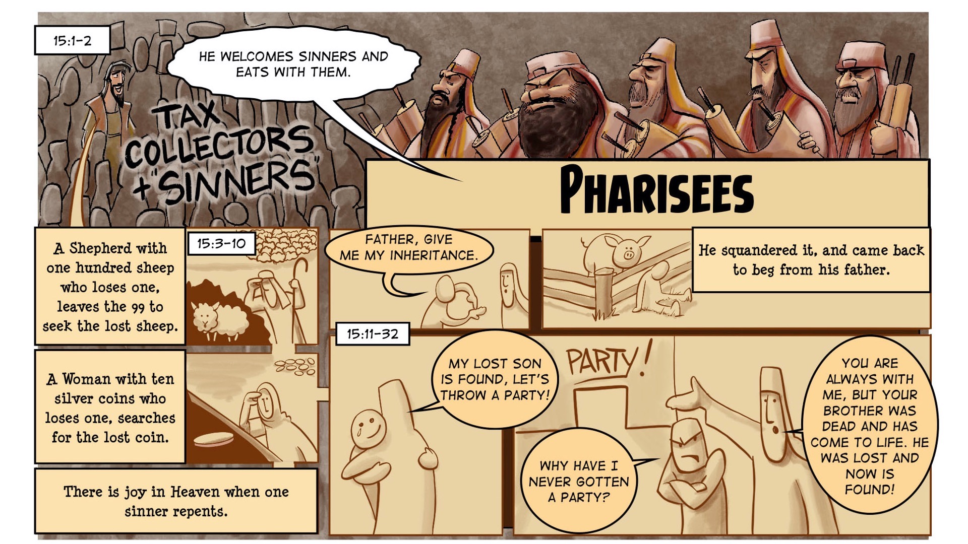 Below you will find two slide shows with very different sets of images for the story of the Prodigal Son. The first comes from A Cartoonist’s Guide to Luke. The second comes from a sermon I gave back in 2019.