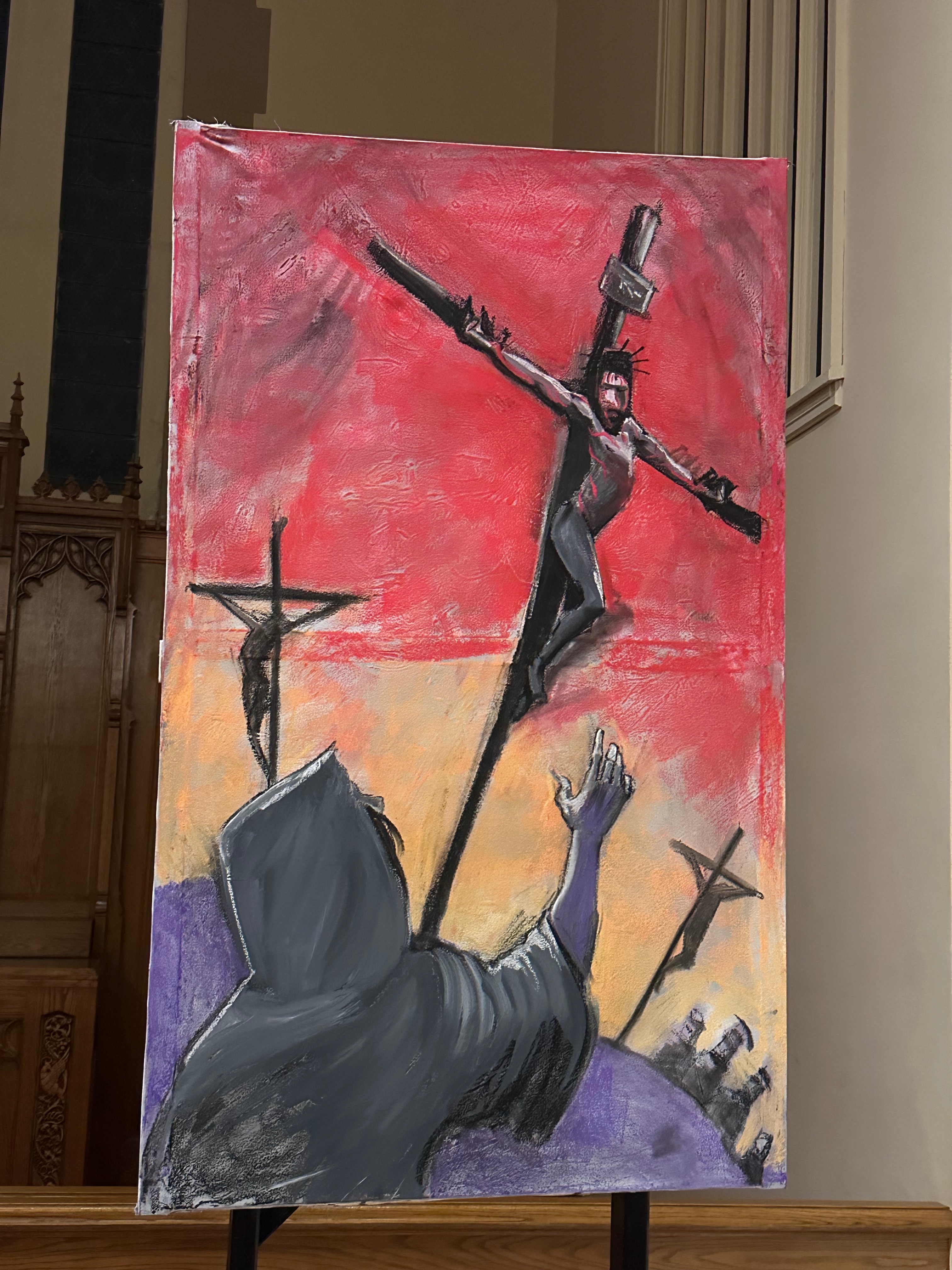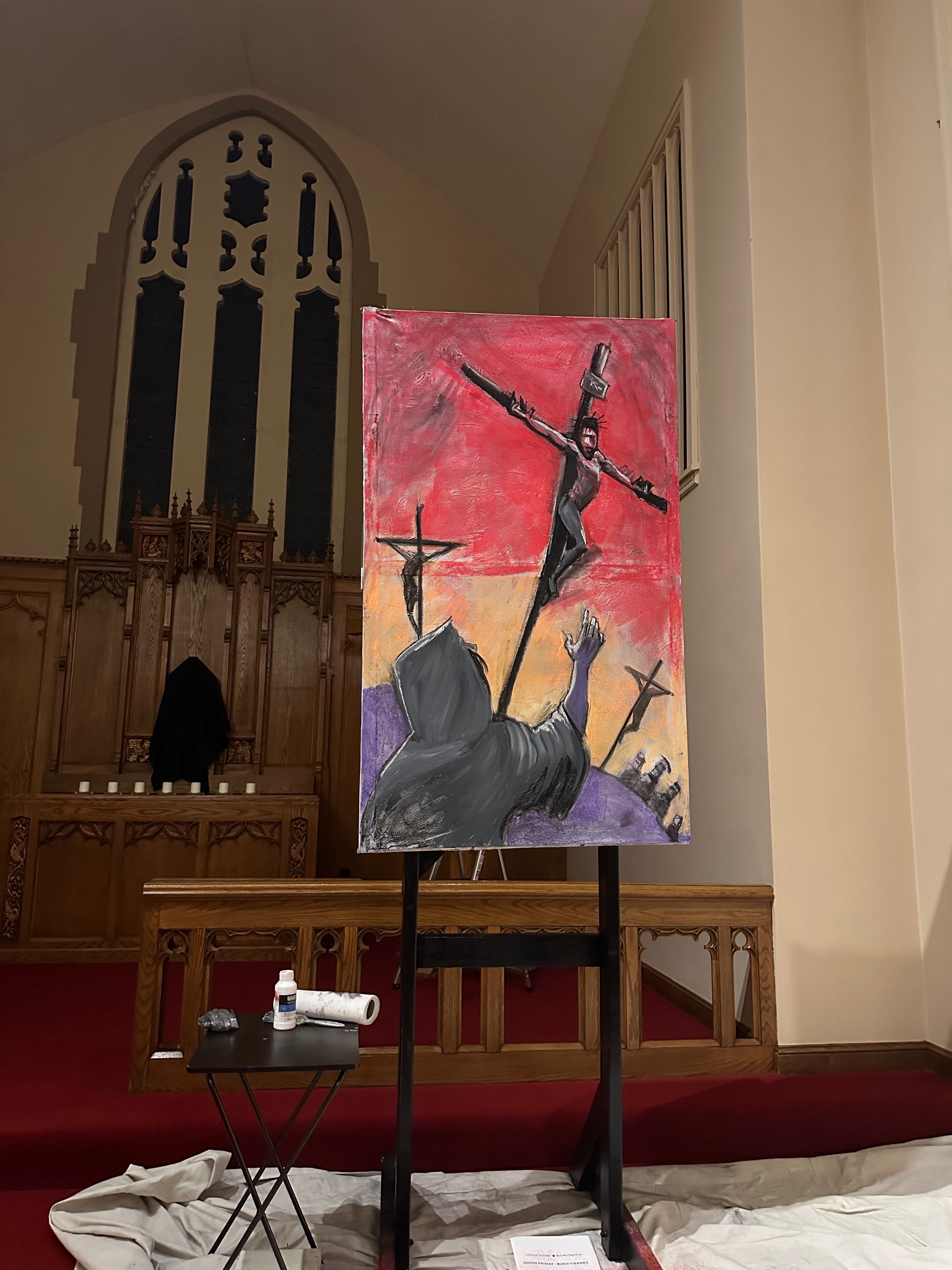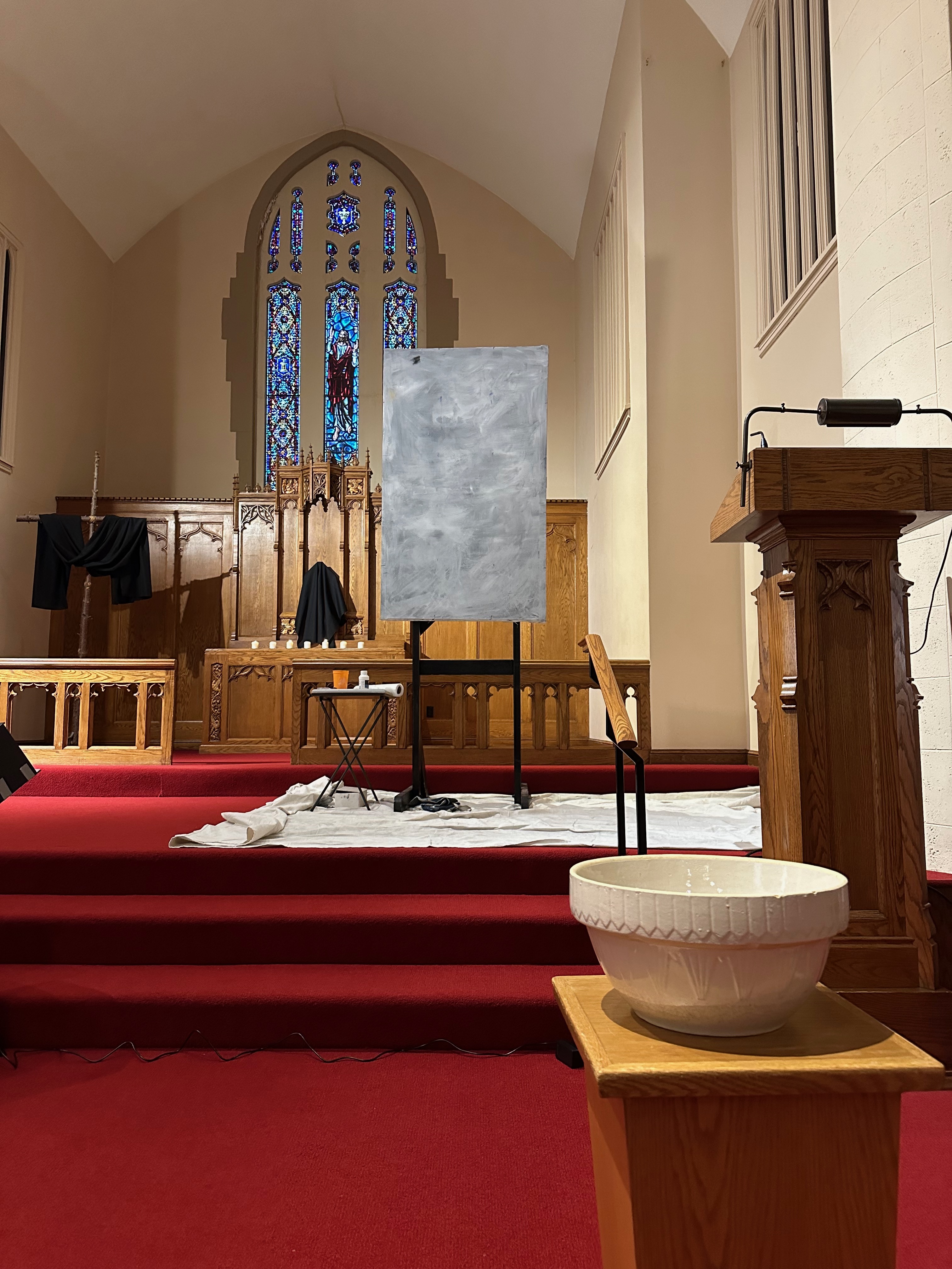 This photo was taken moments before the service started. The texture of this canvas was a happy little accident. I used white primer to cover over another Good Friday painting I had done in charcoal a few years ago. The charcoal mixed with the primer and made this lovely textured gray underpainting.