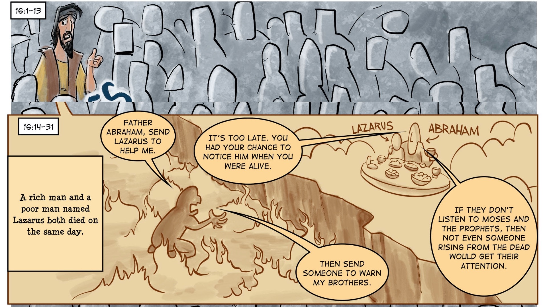 He encounters the Pharisees again. They had overheard what Jesus had been saying to his disciples regarding wealth.