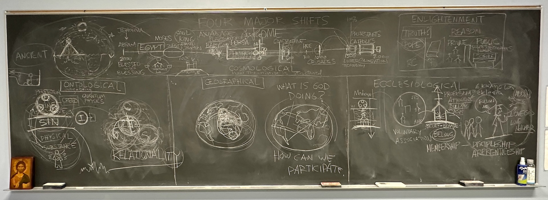 Then it hit me. I have a chalkboard. A big, beautiful blank slate that would allow me to chart out all the big ideas in real time. I sketched my idea on my computer in the early hours on Sunday. I wanted to trace the shifts in three major areas: ontology, geography, and mission. Here’s the sketch: