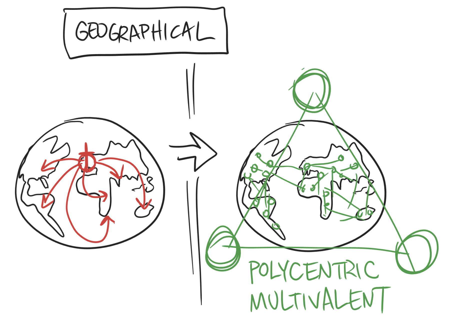 The geographical shift was really a directional shift. The arrows don’t move from Euroupe to the world. The arrows flow from everywhere to everywhere in a networked web of life.